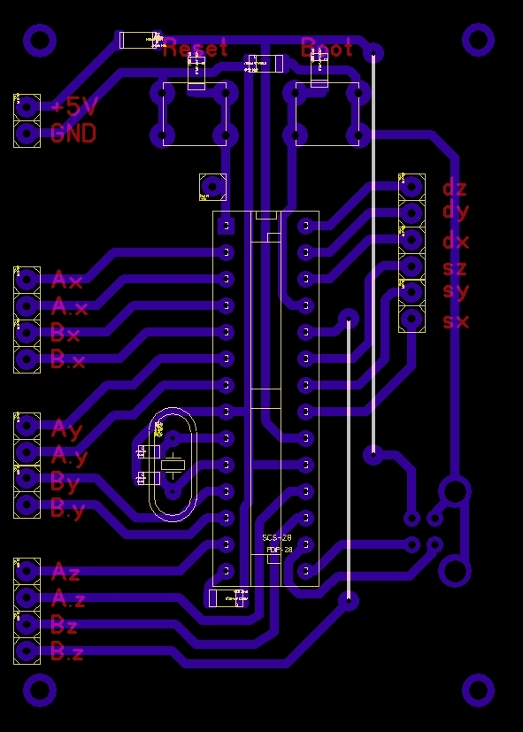 . Az a koncepció, hogy nem loop-ba figyelem a portokat, hanem ha jön valami akkor legyen megszakítás amire egyszerűen és gyorsan reagál a PIC. megszakítás -> ha "dir" egy -> változó bináris léptetése jobbra nulla-> léptetés balra ennyire egyszerű ![]() Maga a változó értéke határozza meg a vezérlés típusát 00110011 -> léptetve 01100110 vagy 11100000 léptetve 11000001 egy motorra nézve (unipoláris) Full step A 10011001 -> 11001100 A' 01100110 -> 00110011 B 11001100 -> 01100110 B' 00110011 -> 10011001 Half step A 11000001 -> 11100000 A' 00011100 -> 00001110 B 01110000 -> 00111000 B' 00000111 -> 10000011 A jövőben át írom 18F4550-re is, hogy a soros portot tudjam emulálva a maradék lábakat másra is használni. Most viszont ez sürgősen kell. Ha a fejlesztgetéssel szüttyögök, hetekig nem lesz működő CNC-m. A próba panel is készen van. A hozzászólás módosítva: Máj 30, 2013