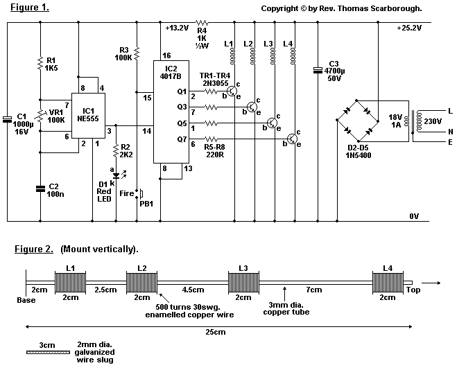 Kondi: 4700µF 450V(~475J) Tirisztor: 1400V 160A Aksi: 12V 2.2Ah Töltő: 15W Boost converter Tekercs: 1,5mm-es rézhuzal, 4cm hosszú a tekercs, cirka 5-7 réteg Lövedék: kb. 25 gramm 6.5cm hosszú, 8mm vastag. (Flexel spirálisan belevágtam hogy repülés közben forogjon.) Képek is vannak!