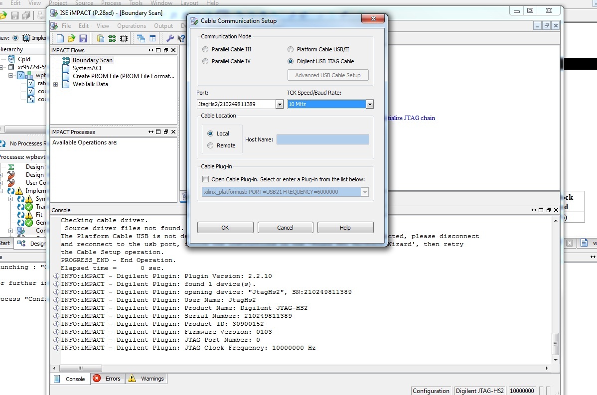 Az IMPACT-ben az Output/Cable Setup... menüben tudod beállítani az égetőt. Gondolom itt a Digilent USB JTAG kell neked, majd OK, és a jobb alsó sarokban ki is kell írnia, hogy megtalálta.