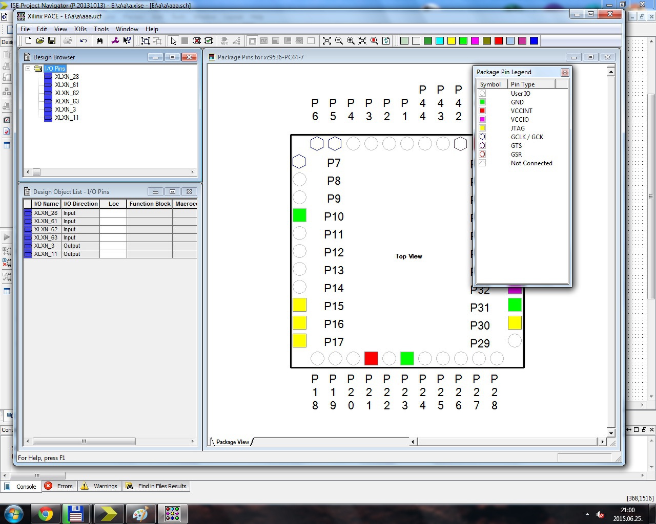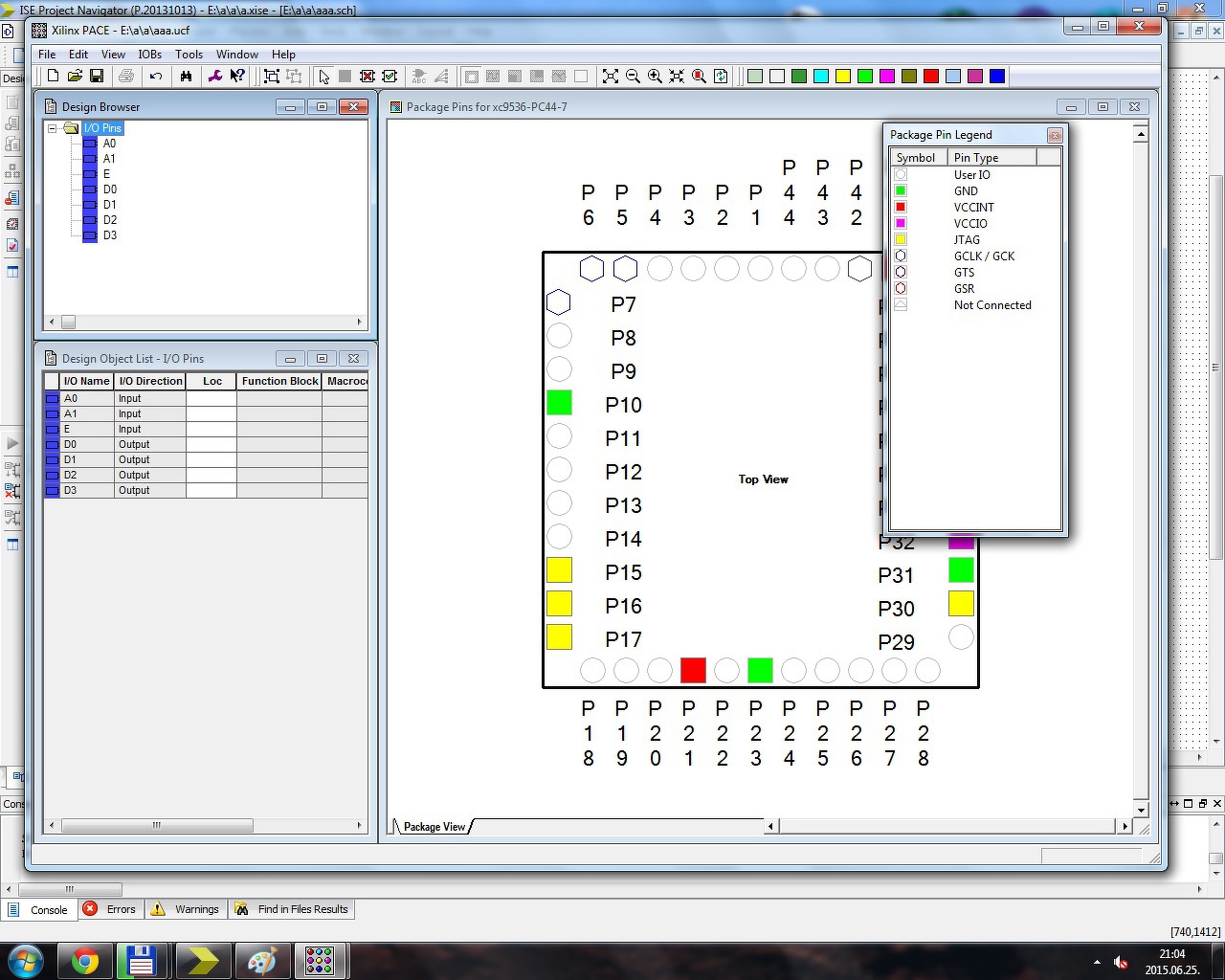 Amíg egyszerű kapukat használok, működik a lábak hozzárendelése, viszont ha elhelyezek pl. egy dekódert, onnantól kezdve, a PACE-ben csak ennek a lábai jelennek meg, valamint az előzőleg összerendelt lábakhoz az ehhez hasonló hibákat dob fel: ERROR