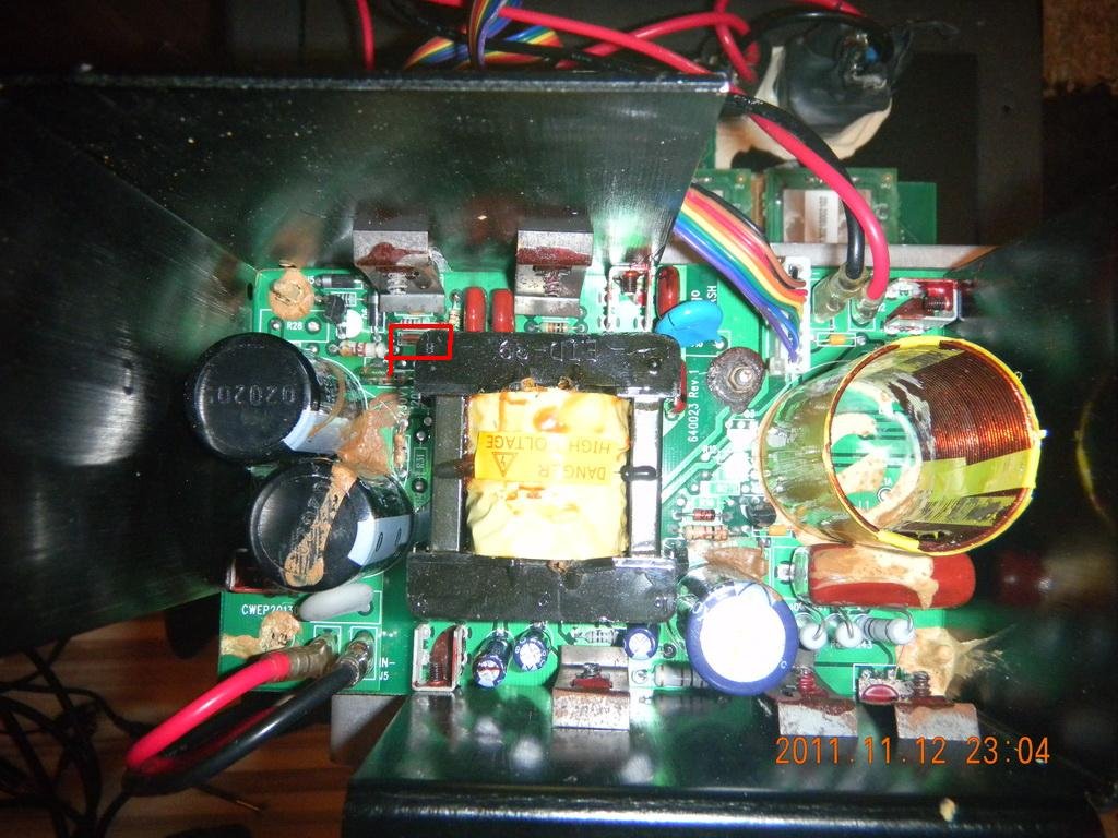 7. A repedtnek tűnő párszáz Voltos kék tárcsakondi a primer és a szekunder oldal közt van, szóval az a táp halálát nemigen okozhatja. De repedt egyáltalán? Vagy az csak ragasztócsík rajta? Ha repedt, akkor ki lett cserélve?