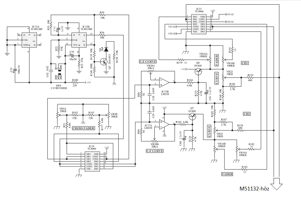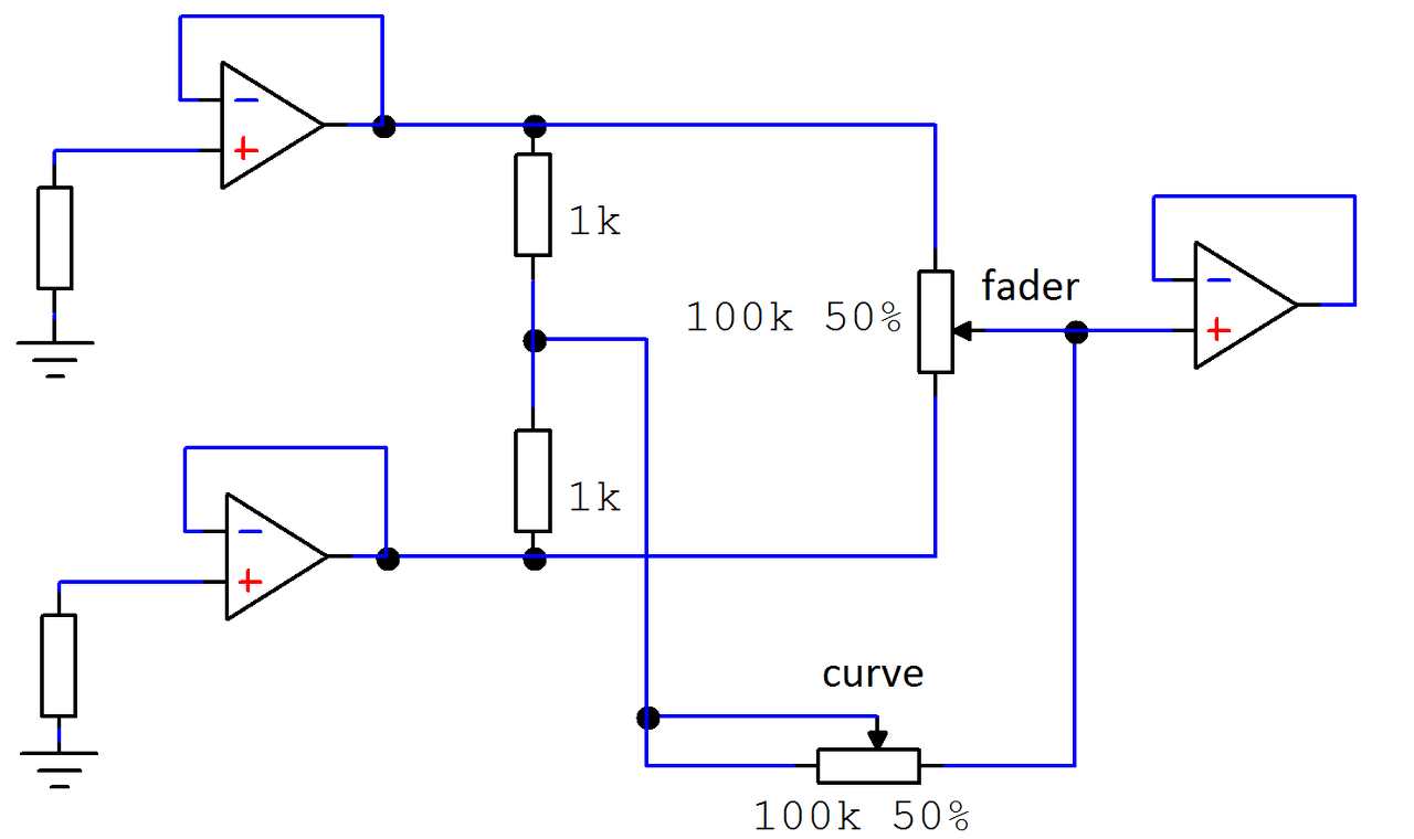 Azért megpróbálnám ezt a kapcsolást. Kell bele két sztereó poti. A fader az lineáris toló, a curve pedig logaritmikus tekerős. A műveleti erősítőnek nem rajzoltam munkapont beállítást, de ha nem akarsz foglalkozni a kapcsolással, akkor nem erőltetem. Természetesen ez egy monó kapcsolás, csak a felét mutatja az egésznek.