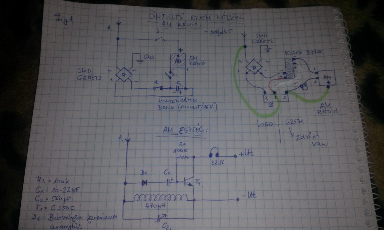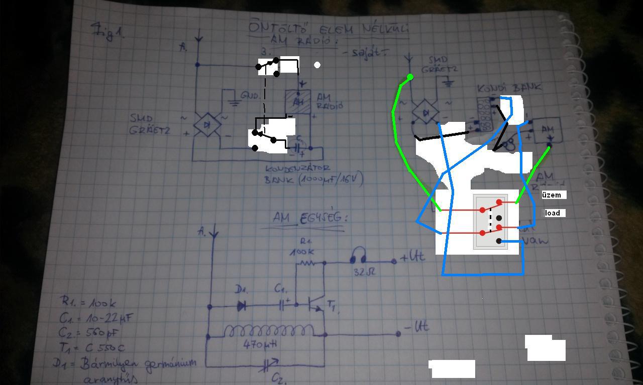 Az gond. Ha pontosan úgy van bekötve mint a jobb felső rajzon a kapcsoló három lábára akkor az "AM rádió" felirat mellett futó zöld drót rövidre zárja a tápot üzem közben mégpedig a tekercsen keresztül. A Greatz híd is félig rövidre van zárva a másik zöld dróttal. Szintén különbség a bal felső jó rajz és a jobb felső hibás rajz között, hogy előbbiben a kapcsolók a negatív tápfesz ágban vannak, utóbbiban a pozitívban.