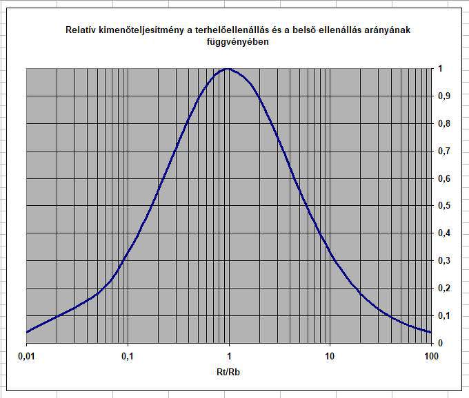 Mellékelek egy diagramot, ami a terhelésre jutó teljesítményhányadot a generátor belső ellenállás és a terhelő ellenállás arányának függvényében. A görbe szimmetrikusnak látszik, de nagyon nem az! (A logaritmikus skála miatt látszik annak.) Ebből látható, hogy ha pl. a terhelőellenállás fele a generátor belső ellenállásának, akkor a kivehető teljesítmény alig kisebb, mint pontos illesztés esetén, viszont ha duplája belső ellenállásnak, akkor nagyjából felére csökken a kivehető teljesítmény. Következésképpen, ha olcsóbban tudsz 2x2000 ohmos hallgatót venni, a 2x4000 ohmosat hagyd meg a gyűjtőknek.