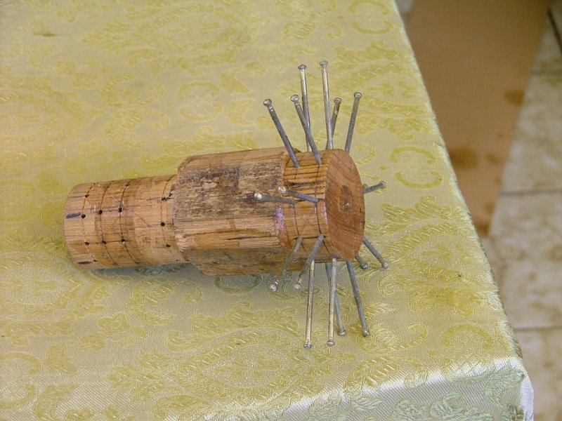 Az elkészítéshez esztergáltam egy darab fát 50 mm.-re,rájelöltem a kerületére egymástól 12 mm-re két kört, amit 9 egyenlő részre osztottam.Körönként 9 szeget beütöttem és az így kialakult csillag sablonra 0.7 mm-es zománchuzalt tekercseltem 12 sorba egymás fölé.A tekerés módja:a kezdet után 2 szeg mellet elhaladva át a másik sorba, ismét 2 szeg után vissza, 2 szeg és át....és így tovább.A mellékelt képeken látható a sablon és a kész tekercs.Miután a tekercs elkészült lekentem színtelen lakkal 2 rétegben.Száradás után a szegeket ki húztam és óvatosan a tekercs első sorát terhelve leválasztottam a tekercset.Ha a lakk túlságosan megszárad, a tekercset nem tudjuk levenni, mert ráköt a sablonra. A rádióban lévő tekercs adatai:kis átmérő 40 mm.nagy átmérő80mm.szélesség 12 mm. osztás szám 9 .Felrakott sorok száma 26.
