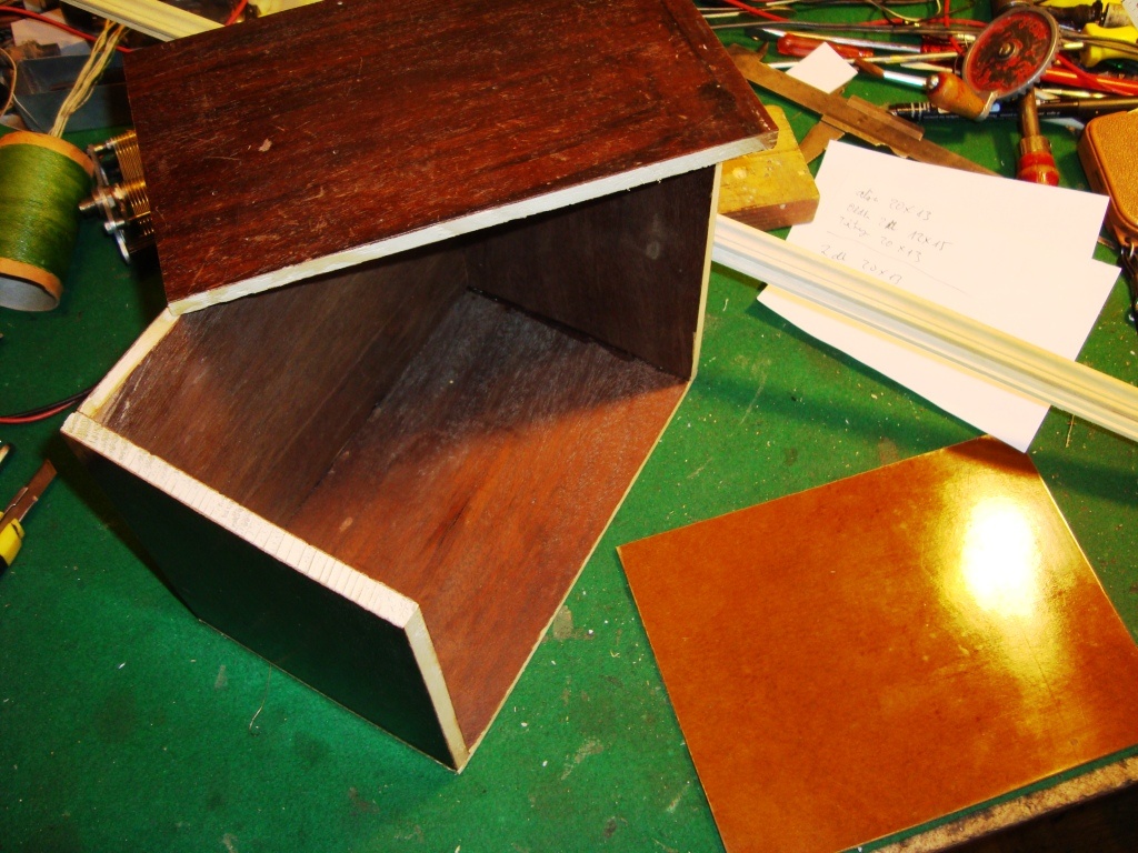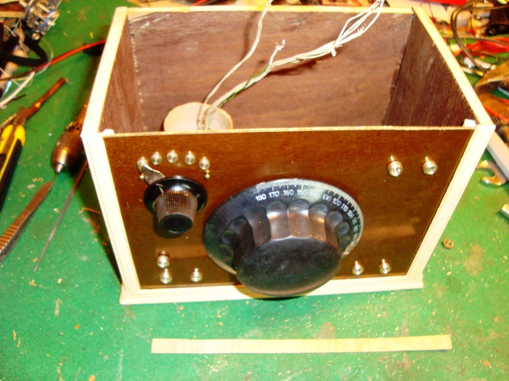Üdv mindenkinek. Év végi takarítás, rámolás közben, találtam a régi kacatok között, egy galenit kristályt. Először azt hittem hogy egy kavics darab, majdnem kidobtam. Mikor rájöttem, hogy micsoda, jött az ötlet, hogy csináljak a gombhoz egy kabátot, vagyis kéne építeni egy detektoros rádiót. Találtam a fészerben régi kidobott bútorlapot, abból lett a doboza, a kristály tartóját rézlemezből, rézrúdból, meg bakelit lemezből csináltam. A tekercs egy VC papír közepe, vékony prespán lemezzel borítva. 80 menet van rajta 0.35-ös szigetelt vezetékből 40 menettől 10 menetenkénti leágazással. Az antenna 40, és 60 menetnél van becsatolva. A kapcsoló, egy régi akkutöltő gombja, bronzlemez leszedővel, az érintkezők 3-as rézcsavarok. A nagy gombot meg a forgó kondit a börzén vettem (jó drágán). A fűrészelt éleket barkácsboltba vett fazon léccel takartam el. A doboz anyagán igyekeztem meghagyni a régi pácolást, csak kicsit megcsiszoltam, és belakkoztam hogy réginek tűnjön (az is.) A kis készüléken kb 30 méteres padlásantennával szépen jön a Kossuth meg a helyi adó, éjjel pedig több külföldi állomás is. A többi a képeken: