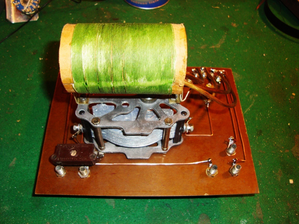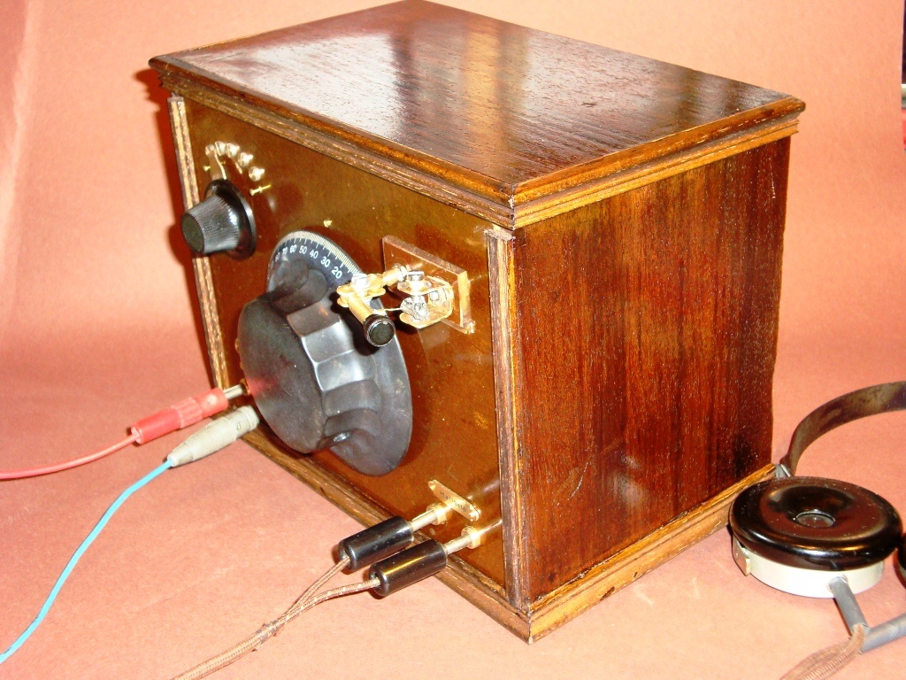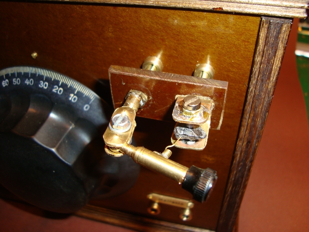 De igen a múlt héten készült, nevesül csütörtökön, igaz nem Kínában, hanem itthon, mivel magam csináltam. A csatlakozó egy régi villásdugóból való, a többi meg bakelit lapból, rézlemezből, rézrúdból lett kialakítva Az alkatrész maga a kristálydetektor, vagyis egy galenit kristály, amihez egy tű érintkezőt kell beállítani, és az érintkezési felületen létrejön a "detektátás," vagyis az egyenirányítás.