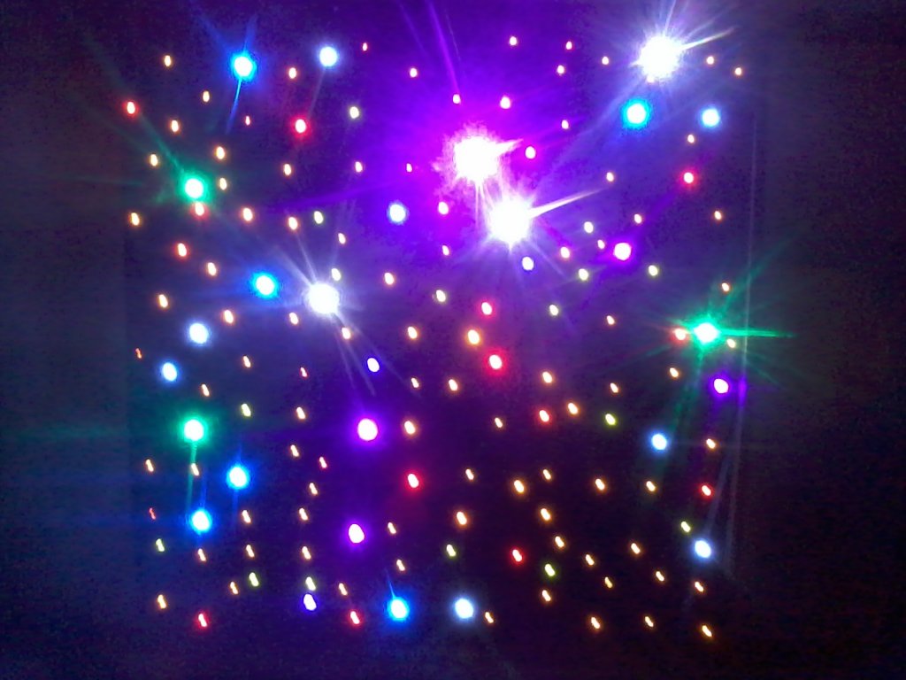Vágattam az üvegessel egy 5x10cm 8mm vastag üvegből egy lapot. Az oldalába 5mm lyukakat fúrattam mindkét oldalon. Egyik oldalra 5mm-es RGB ledeket tettem (6db-ot) a másik oldalon lévő furatokba pedig 10 üvegszálat összeragasztottam és a ledekkel szemben lévő furatokba toltam be koppig. Az üveg belseje remekül vezeti a fényt és a koppig betolt üvegszálakhoz rendkívül jól adja át. A vezérlést egy PIC-el fogom megoldani infra távirányitóval lehet majd kiválasztani a csillagos égbolt változásait. Egy ilyen vezérlő cucc kb 60eFt ezt meg összehozom tizedéért. Ha elkészül -és igény van rá- teszek fel képeket is! Üvegszálat optikai kábelből termeltem ki, 20 centis darabokban. Állitólag lehet a kereskedelemben is kapni és nem ökör áron.