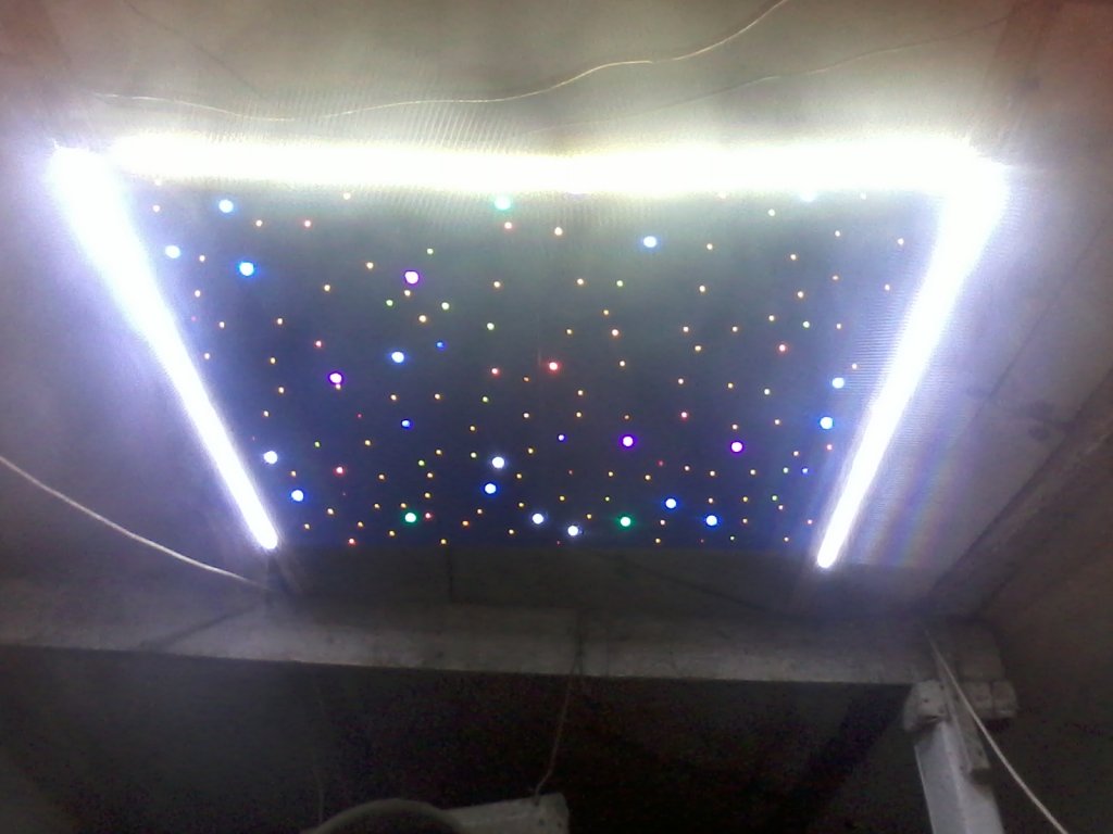 A műhelyemben készítettem egy kis világítást ledekkel. Az első képen a csillagos égbolt van alulnézetből, utána oldalnézetből, majd pedig a ledcsíkokkal együtt. A szalagok bőséges fényt adnak. A ledes világítás részemről megoldva.
