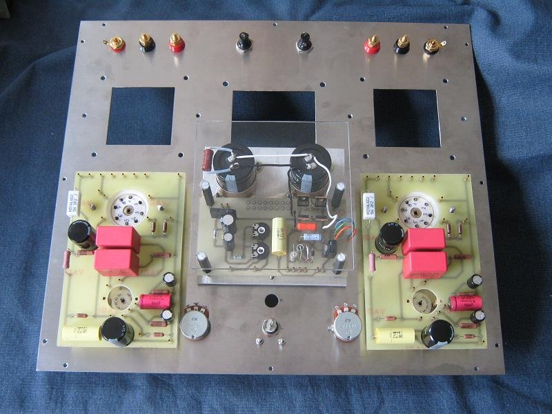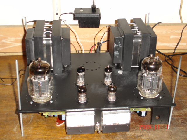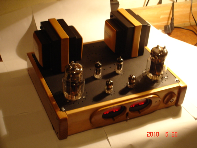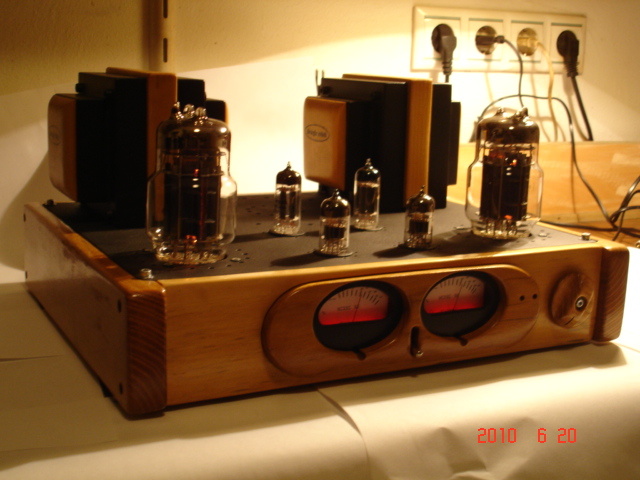 A belvilágról régebben tettem fel itt a fórumon képeket,ez azóta nem változott.A két furaton trimmerekkel az anódáramot tudom állitani,a trafók saját tekerésűek,mayky tervei (SM 102b) a burkolatát plexi darabokból vágtam ki és összeragasztottam.