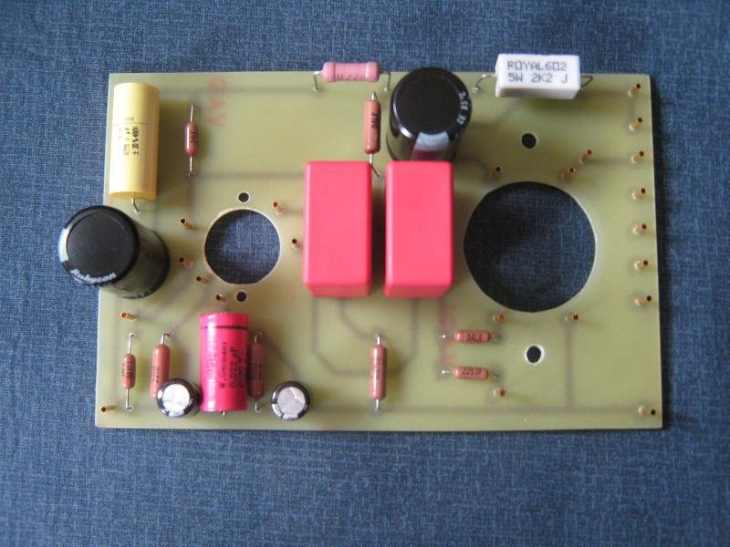 Én is valami hasonló dobozt tervezek most készülő triódás erősítőmnek. A tápegység csak ideiglenes. A 100W os villanykörte a CRC szűrő R tagját helyettesíti. Természetesen a 25A-es Graetz helyett egy kisebb példány lesz a végleges verzióban.