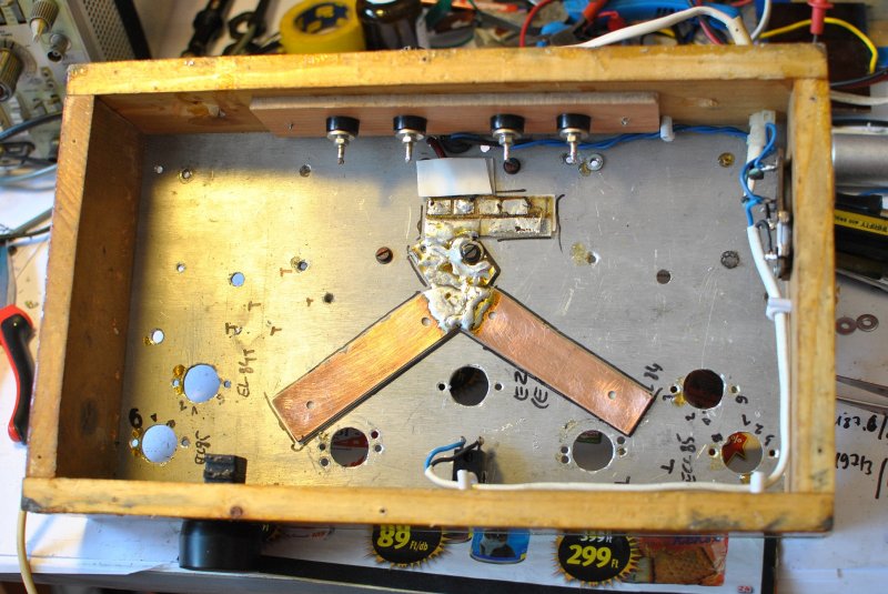 6,3x760 mW plussz 5 százalék? (inkább legyen túlfűtve 5 százelékkal mint alul?) ennyire szét lett robbantva a kicsike, és ujjraépítve...igaz ez még pentoda mod, nem kellett volna triodában meghallgatnom, mert most úgy maradt... 7V PP 4 Ohmon 1kHzen és 100Hz en 30Hz en csak 6VPP a teljes torzítatlanság, azaz sacc 1,5W...de mégis hatalmasat szól. 2 napig csiszoltam le az ótvar puha ragacsos ráncos lakkot, ha felgyújtom már rég kész lett volna, na de ez öreg fa, szép a színe. kapott eddig 10 réteget, most 1 hetet szárad, csiszimiszi és megint 1 réteg...természetesen fújva. A két kimenő is 2 szer át lett lemezelve aztán válogatva lettek a lemezek és egyformára lemezelve mire jó lett, mert volt, hogy az E hez ragadt I bent maradt 3 db on és simán össze lett rakva, ejnye Müszi bá! Azért lett 2x szétszedve mert kipróbáltam légrés papír nélkül is, most sütőpapírral igen kis légréssel jó lett. 1 képen a csillagpontos föld van csak a dobozban 2 képen a brumm minimum fülre egy érzékeny hangszóróval, 1 tized mm hatalmasat változtatott, úgyhogy fakötésű alátét önzáró 8.8 as anya és szakadás előtt egy picivel van meghúzva, nem is mozdult el, pedig még alá is akartam lakkozni. 3 képen egy összerakott belső közeli a szendvicsől.