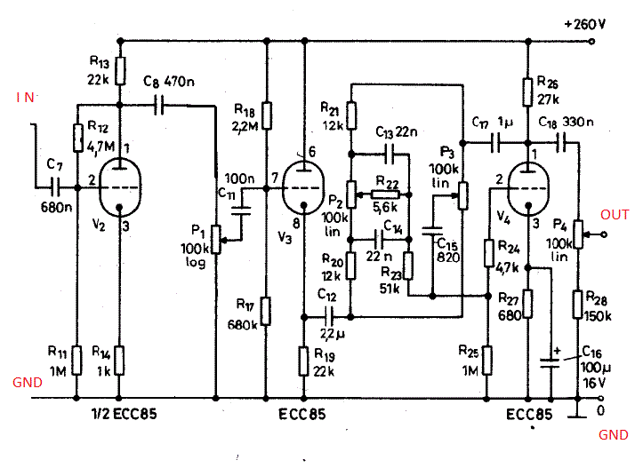 Ebben a bekötésben melyik két csőrajz tartozik egybe? a kötépső és az ami alá az van írva hogy 1/2 ecc85-ös? Meg még azt szeretném kérdezni hogy azok alineáris potenciométerek mire vannak? Basszus meg többi?