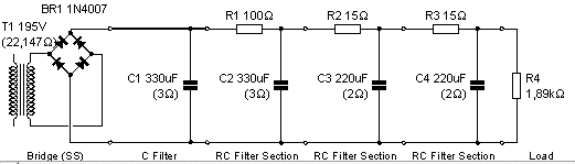 CRCRCRC szűrést, a csatolt képen lévő kialakításban és értékekkel. 275V egyen jön le a graetz hídról. A szűrés ellenállásai összesen 133ohmot alkotnak, azokon 17V esik, így az anód áram a most bekötött 5 darab pcl/elc86 csőnél 128mA, az anódfesz pedig 240V, ami így 31W felvételt jelent és 4W elfűtött teljesítményt. Az ellenállás értékeket onnan vettem, hogy itt Bővebben: Link azt írják: az RC szűrőben az ellenállás értéke 10x legyen nagyobb, mint a kondenzátor Xc értéke 50Hz-en, ennek megfelelően lettek betéve. Most még mindig van egy kis maci. A diódákat a graetzben kimértem, mindegyik jó és a rájuk tett kis kerámia kondi sem hozott változást. A fűtésnek mindegy, hogy egyik vezetőt lekötöm testre, vagy kiközepezem, semmi eltérés nincs a brumm terén. Amit észrevettem, hogy ha 1 cső van bent és a jelvezeték csatlakoztatva van, míg a többi csatorna vezetéke nincs bekötve, akkor nincs maci. Akkor sincs, ha a többi jelvezetéket is csatlakoztatom. 2 csőnél már van maci... Ha több cső is bent van, de a vezetékeik nincsenek csatlakoztatva csak 1 csatornánál, akkor erősebb a maci. Minden a csillagpontban találkozik, már nem nagyon értem a dolgot. Az összes csatorna forrása ugyanaz a berendezés.