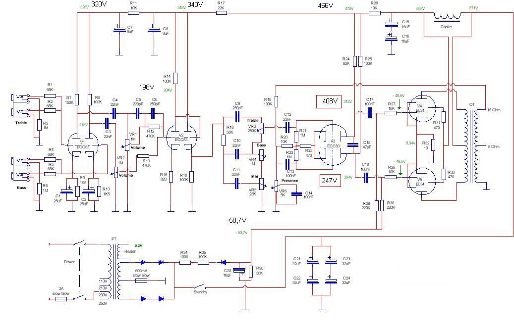 Néztem a rajzot ill. a linkelt Angol oldalt , én a jobb oldali trióda rácsára R5 ellenállással párhuzamosan tennék úgy 10 nF kondít . Egyenáramilag még ok de váltóáramilag nem igazán . A bemenetre is 10 nF kondi .