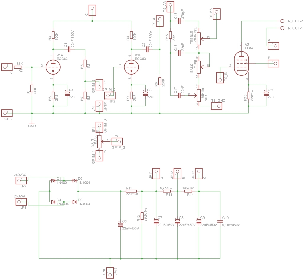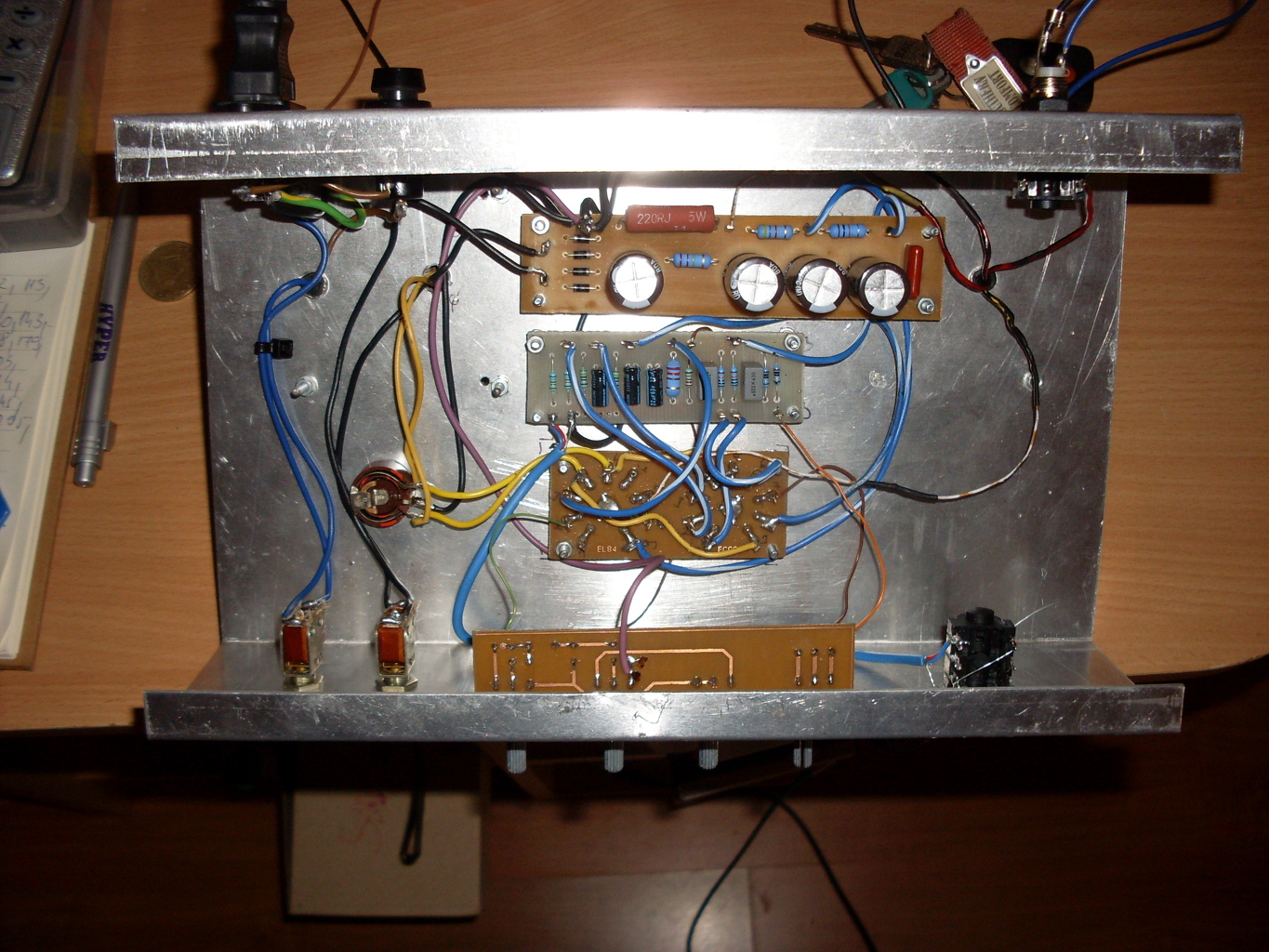 Úgy lett kialakítva hogy, külön a táp a hangszín+gain egy panelre és a többi alkatrész.