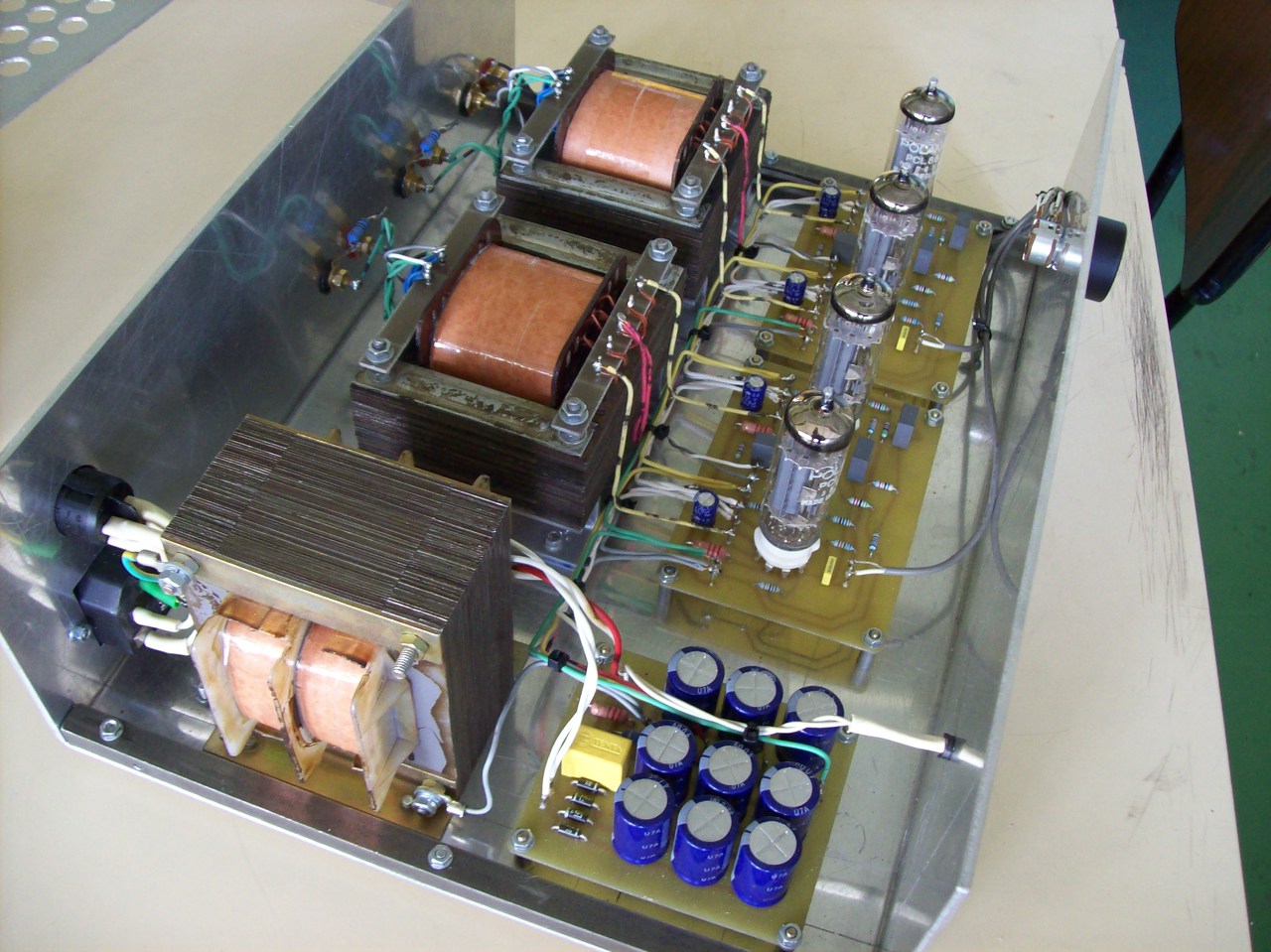 Szép, letisztult belső, átgondolt kábelezés. A katodin részben és a hangszórókimeneten mekkora ellenállásokat használsz? A kimenő teljesítmény és a tápfesz mennyi lett?