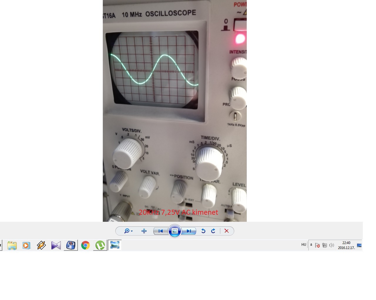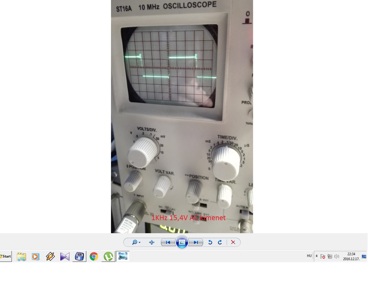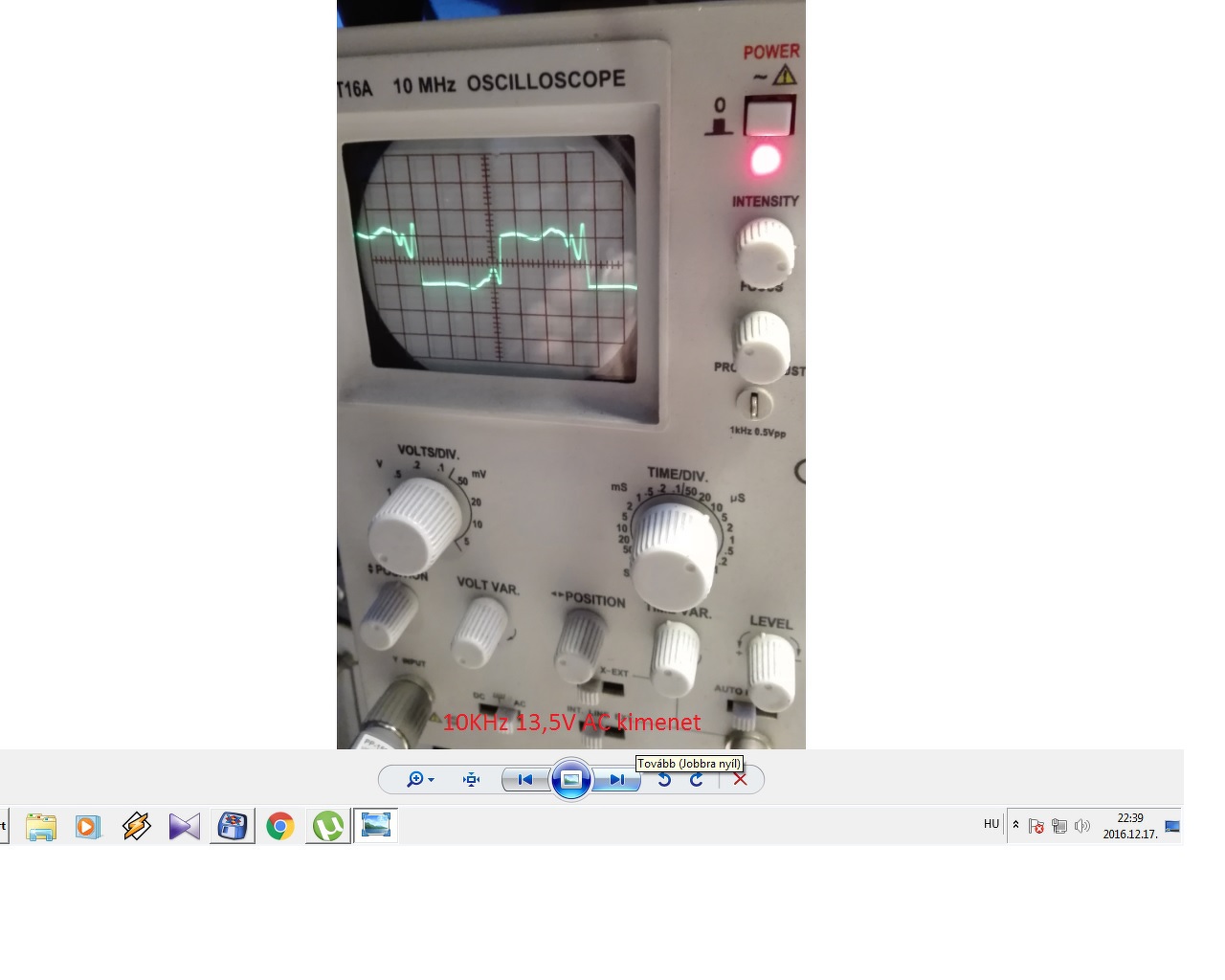 Ma sikerült be üzemelnem a CHZ féle 2X35W-os csöves erősítőt. Sikerült szépen be állítani a 10 ohmos katód ellenállásokon a 450mV feszültséget, de a szimmetriát állító 47k trimer potenciométerrel semmit nem tudok állítani, vagyis nem veszek észre az oszcilloszkópon semmi jel alak változást és feszültség változást sem észleltem ha csavargatom. Az NFB ellenállás 10K Az anód feszültség 420 V Csináltam egy pár képet az oszcilloszkóp méréseimről. Hát mit mondjak nincs olyan jó mint amit CHZ erősítőjéről láttam, ott sokkal de sokkal szebbek voltak a jel alakok! Nálam még lehet valami hiba hogy a magasabb frekvenciákat valahogy nagyon el torzítsa már 10KHz-nél a négyszög jel nem valami szép!, a 20KHz-röl ne is beszéljek. Jöjjenek a képek.