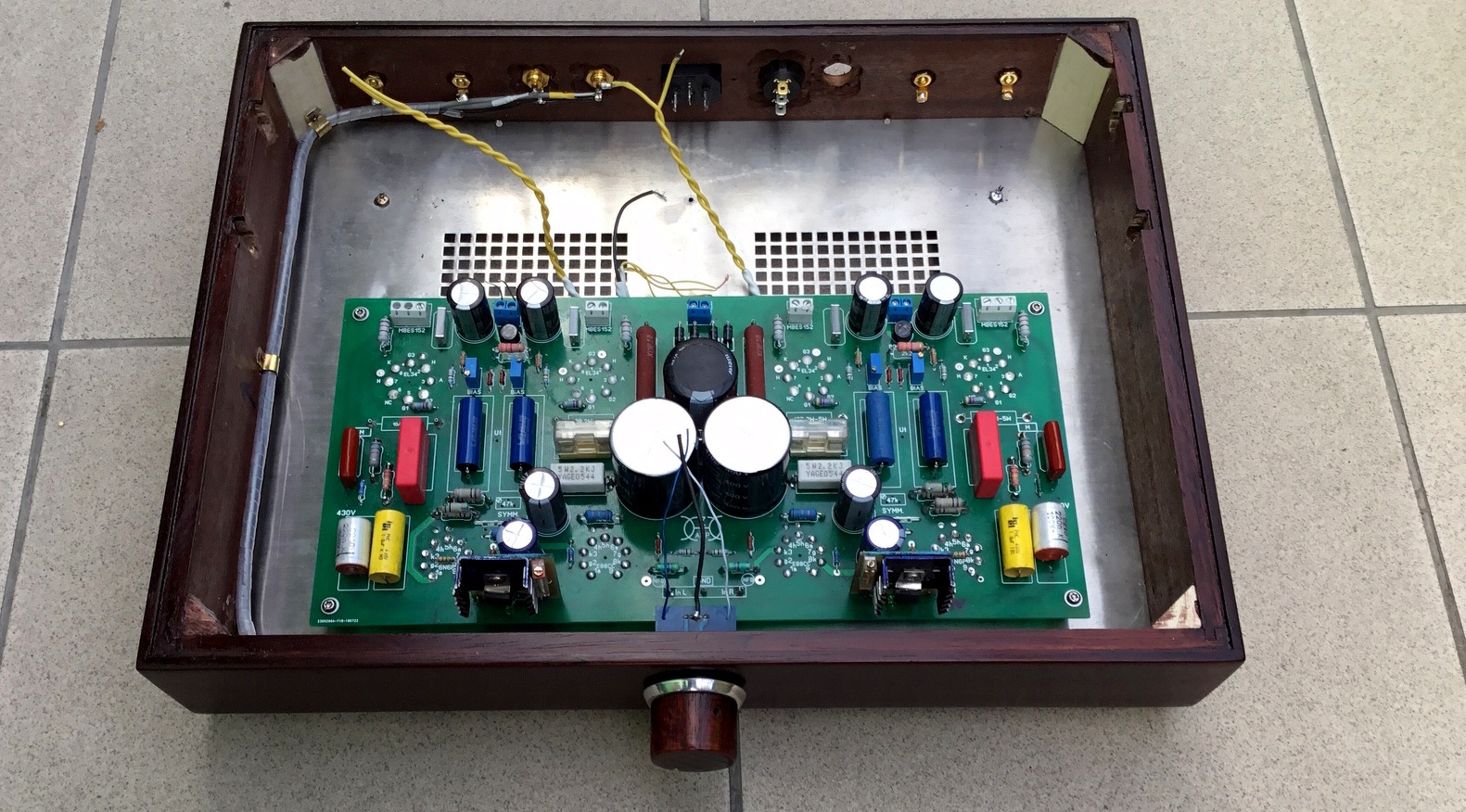 Barátomtól kaptam (hibás)6AS7PP erősítőt, légszerelve, dobozát hasznosítottam. Új fedelet kell hozzá készítenem, többi megfelelő.. Én 420x320x70 mm nagyságú dobozt használok, ez kisebb 400x300x60mm.