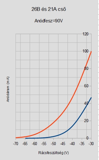 Hogy az enyém így néz ki, és nem egy hatalmas doboz a tetején tele csőfoglalatokkal annak több oka is van. Mutatom a "legjobb" és "legrosszabb" csövem grafikonját, természetesen mindkettő új, de látszik, hogy mekkora szórásuk van az új csöveknek is. Viszont az adatlapi paraméterben mindkettő benne van, mert az azt írja, hogy ha Ua=90V és Ug=-30V, akkor Ia-nak 76+/-36mA-nak kell lenni. Illetve ha Ug=0V és Ua=45V akkor 150mA körüli áramot kell produkálniuk, az egyik 146 a másik 188mA-t produkál.