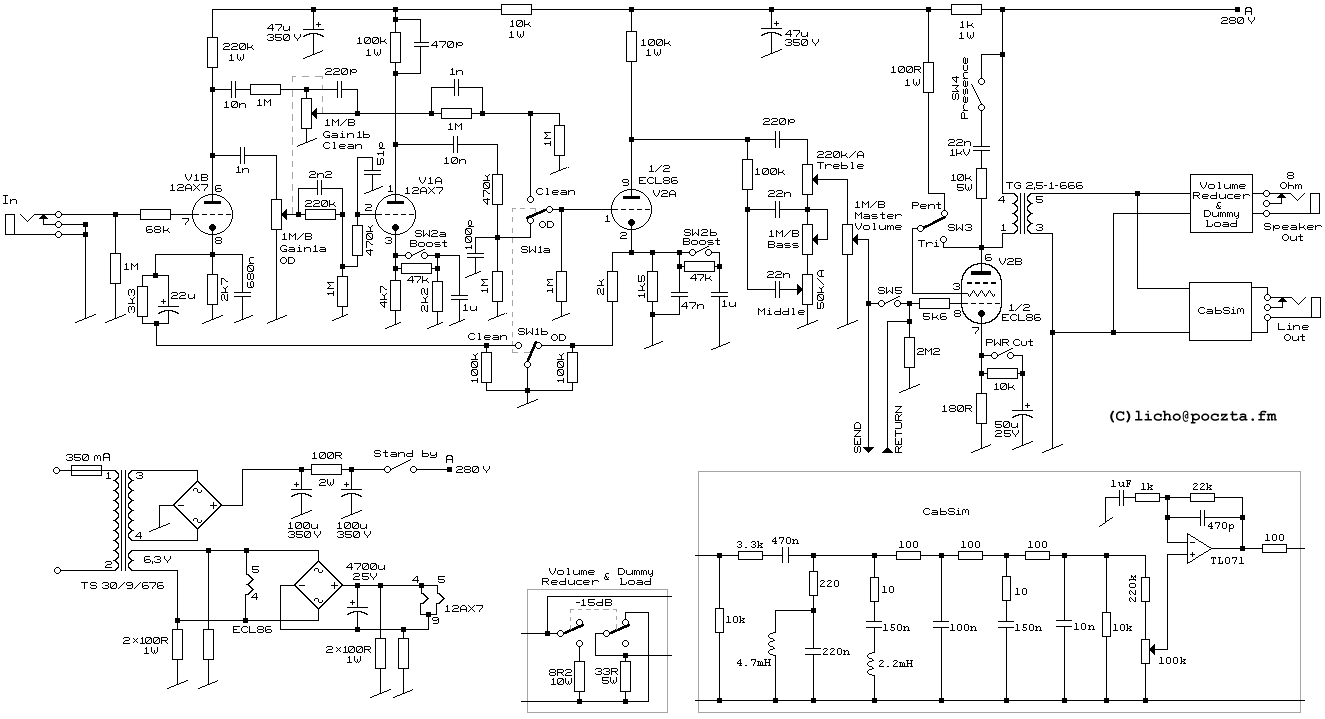 Nos, találtam egy rajzot, lehet, hogy abból ki lehetne indulni. Elég bonyolult a rajz, le kellene butítani csupán egy tiszta csatira. Feltéve persze, ha trafók jók + a 12ax7-es cső kicserélhető ecc85-re:http://licho.rowerpower.org/gitara/foxtrot/index.html