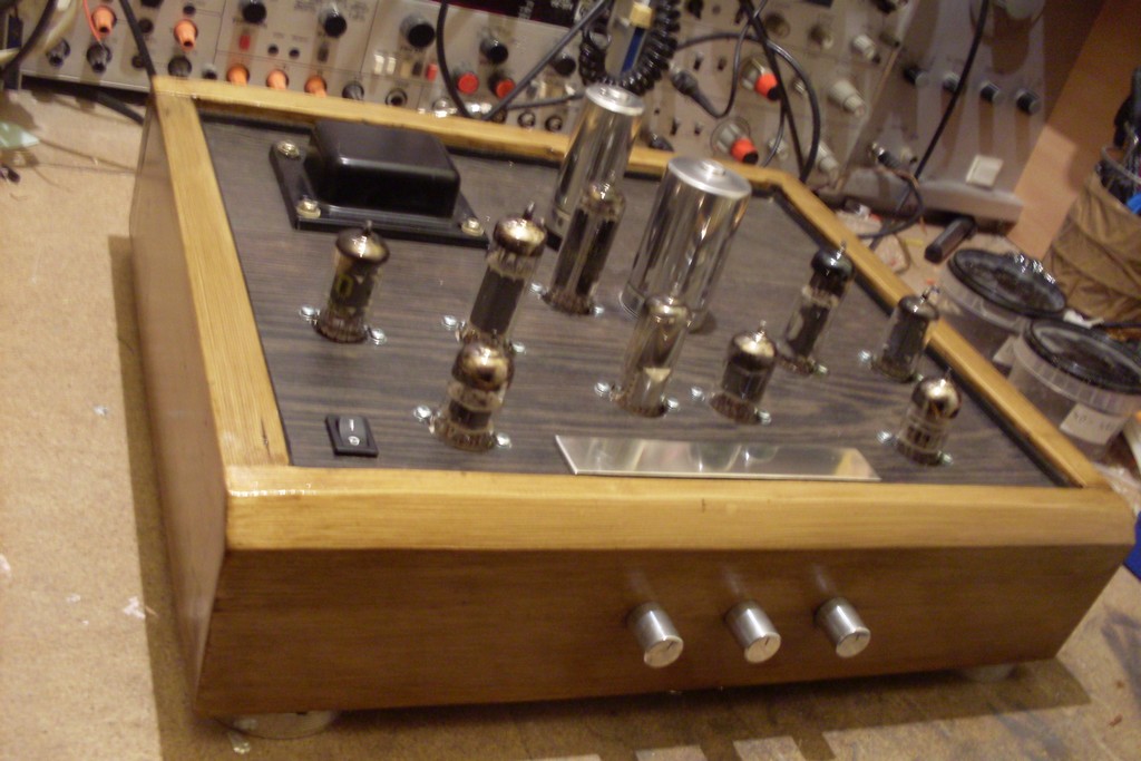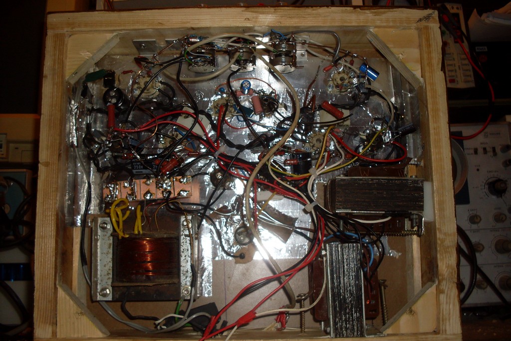 Az előerősítő / hangszínszabályzó már kész van, és remekül működik, odatette ami még hiányzott, megjött a mély és a magas is, igaz nem sok de pont elég. A felirat még hátravan a potik fölé, egy szép bekapcsolás jelző izzót szeretnék még, ami korhű lenne, LED-et nem akarok beépíteni, az alját is még ki kellene találnom. Apropó alja, CIROKL kérésére, és csakis az iránta való tiszteletből teszek fel képet a belsejéről, mert erre nagyon nem vagyok büszke, dehát nézzétek el ezt most nekem, hiszen az első csöves erősítőm, és légszerelésem. No de elég a dumából, beszéljenek a képek.