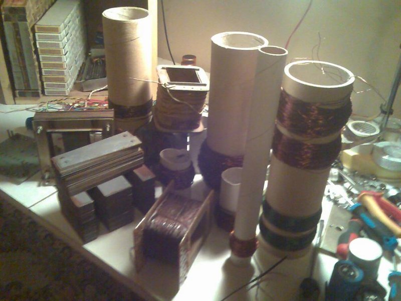 Szétszedtem a kiszemelt hálózati trafónak valót, a primer 265 menetje már meg van tekerve netto 1mm-es huzalból, leszigetelve és leárnyékolva a leendő szekundertől (azt nem szedtem le). Holnap már tekerek is rá valamit, ma még az a terv, hogy kétutas egyenirányítással csinálom a tápokat, úgyhogy 0,4-es (netto) huzallal tervezem az anódtekercset, 2*214 V-ra, azért ennyi, mert van egy 800 µF 300 V-os orosz vakuból származó kondim (nagyon jó darab), és ezzel akarom kezdeni a szűrést. A második lépcsőben 1-1 db angol 470 µF 400 V-os lesz. Két 6,5 V-os fűtőtekercset tekerek 1,8 mm-es (netto) huzalbó a 33-asoknak. Ezen a trafón ezenkívűl csak 2*120 V lesz 0,25-ős drótból, előfesz céljából, bár ezt valószínűleg nem használom majd, hanem a másik hálótrafóról oldom meg (de biztos ami biztos, legyen rajt).