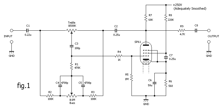 Mindkettő gitárhoz van optimalizálva, túl nagy az erősítésük egy vonali szintű jelforráshoz, az fa ( alsó határfrekvencia ) viszonylag "magasan" van, (gitárhoz), a "Fedner"-típusú hangszínszabályozó olyan frekvenciákon szabályoz, ami "konzerv zenénél" használhatatlan, ráadásul lineáris állása nincs, folyton "vág" valahol, a szabályzók is elhúzzák egymást ! a másik áramkör is gitárelőfok, ugyan lepke hangszínnel, de az erősítés itt is túl nagy ! az "alsó" bemenet kisebb érzékenységű, mert közvetlenül a "lepke" hangszínkör bemenetére megy, bár ez így működhet, de azért, mivel viszonylag nagy csillapítása van, sé nagy bemenő impedanciával rendelkezik, érdemes legalább egy katódkövetőből hajtani, és előtte, vagy utána a megfelelő erősítést biztosítani ! Itt mindkét cső viszonylag nagyot erősít (gitár!), de a második fokozat osztott anódellenállásával a kimenőjelet leosztja ! (rosz jel/zaj viszony, azonban így biztosítja a kis, "gitárszintű" kimenő jelet, hogy a következő fokozatot , vagy az erősítő bemenetét ne vezérelje túl - már, ha ez nem cél ... a kapcsolásból ítélve, ez "kompakt pedál" funkciót tölthet be ... )