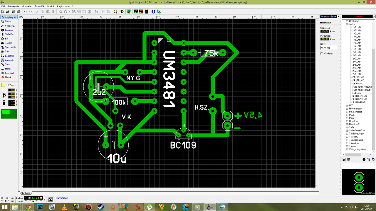 Még csak nagyon kezdő szinten foglalkozom az elektronikával ezért gyakorolni szeretnék. Kerestem a neten egy egyszerű dallamcsengőt, de csak a kapcsolást. Most elösször próbáltam meg kapcsolásból nyákot készíteni.(Olyan már volt hogy néhány dologgal kiegészítettem egy rajzot.) Sprint Layout 5.0 programmal készítettem. Azt szeretném kérni hogy valaki "leellenőrizne" hogy jó-e így a terv vagy még mit alakítsak rajta? Van 2 alkatrész amit nem találtam meg az a V.K. (Váltókapcsoló) és a(z) NY.G.(Nyomógomb). Minden észrevételt,ötletet szívesen várok! Segítségeteket előre is köszönöm.