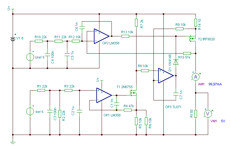 Tekintve, hogy a szabályzón és az áramfigyelő ellenálláson is feszültség veszteség van, a kapcsolást célszerűen egy Step-Up (pld. MC34063) konverterrel kellene kezdeni. A konverterrel előállított 7-9V feszültségből aztán ismét lehet 0..5V-ot készíteni. Innentől viszont ár Off ez a téma, hiszen ez már labortáp kategória. De gondolatébresztőnek rajzoltam számodra egy áramkört. - Gondolom a feszültség és áram alapjelet, a DIO kimenetről PWM szabályozással gondoltad átvinni. - Ha így van, akkor egy 5V-os referencia feszültséget lehet az áramkör bemenetére kapcsolgatni a PWM-el, mondjuk egy analóg kapcsoló közbeiktatásával. (Hogy a referencia feszültséget ne a digitális kimenet feszültsége szolgáltassa) - Így a PWM jellel, a kimenő feszültség és és áram nullától végértékig szabályozható. - A táp kikapcsolását meg lehet oldani a DC/DC kikapcsolásával, vagy a meghajtó FET Gate feszültségének rövidre zárásával. - Ha galvanikusan elválasztott kimenti feszültséget szeretnél, akkor a DIO PWM és kapcsoló kimenetét egy-egy optocsatolóval kel leválasztani, és ezt vezetni az analóg kapcsolóra. üdv! proli007