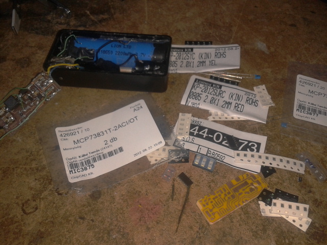 ... még azt észrevettem, hogy kb egy nap állás után le is merült eléggé a li-ion cella,(úgy, hogy rajta volt a 4 elektronikai egység: töltő, mélykisülés elleni védelem, konverter, és a fesz figyelő, a telefon töltése nélkül) de kiderült, hogy a zéneres feszfigyelőm miatt, ami fixen rajta volt az akkun. Ezért azt a "zseblámpa"-val fogom vezérelni, amikor a lámpa be van kapcsolva, akkor működik a fesz figyelő, így ha a lámpa világít, de a feszültség figyelő ledje nem, akkor még van enerdzsi az akkuban.