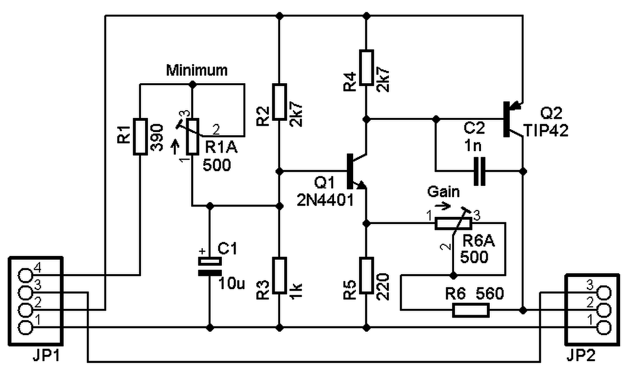 Fordított logaritmikus poti adja a legkényelmesebb fordulatszám állítási karakterisztikát. Ha az nincs, és a poti lefelé tekerése (nagyobb fordulathoz) túl kényelmetlen lenne, akkor 1k körüli lineáris potival ugyan kisebb tartományban, de kényelmesebben állítható be. T1 és D2 legyen termikusan közel egymáshoz! A tekercs lehet pl. sárga-fehér toroid porvas 30-40 menettel. A bemeneti elkó mindenképp jó minőségű, Low ESR, vagy a megadottnál nagyobb kapacitású legyen.