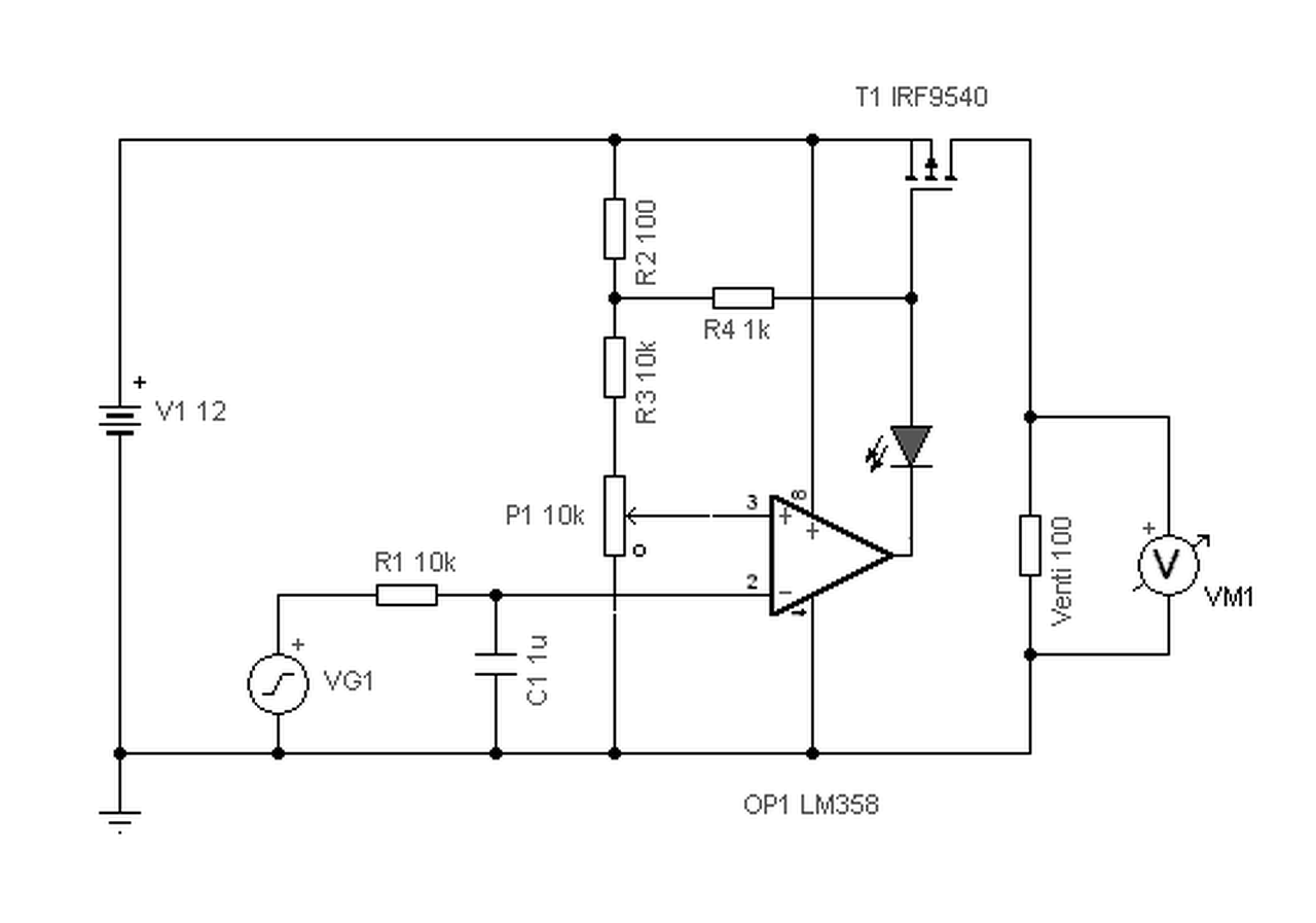 Te pedig azt írod, hogy egy adott ponton ki-be kapcsoló kellene. Vagy is egy komparátor, mely egy kitöltés felett be, alatta ki kapcsolja a ventit. Vagy is itt amit küldtem, a PWM jel integrálva van, így analóg jel képződik belőle. Majd ezt követi egy komparátor, mely ki-be kapcsolja a ventit, ha a PWM jel egy kitöltési pont felett vagy alatt van. Tehát a venti vagy forog, vagy áll. Azt kellene megtudni, hogy így megfelelő-e számodra. Mert a Fet itt nem szabályoz, hanem kapcsol.