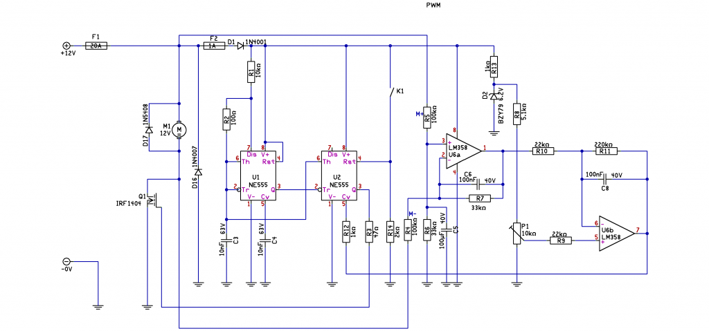 Az alábbi kapcsolásbam miért melegszik egyre jobban a fet ha a potmétert minél lejebb tekerem? Ennek pont az lenne alényege, hogy ne melegedjen. Most üresen megy a motor /2-3A/ de ha terhelve lesz akkor 18-20A lesz a felvétele. Ha a motort kicserélem egy izzóra akkor hideg marad a fet. Valamit a motor csinálhat. Köszönöm.