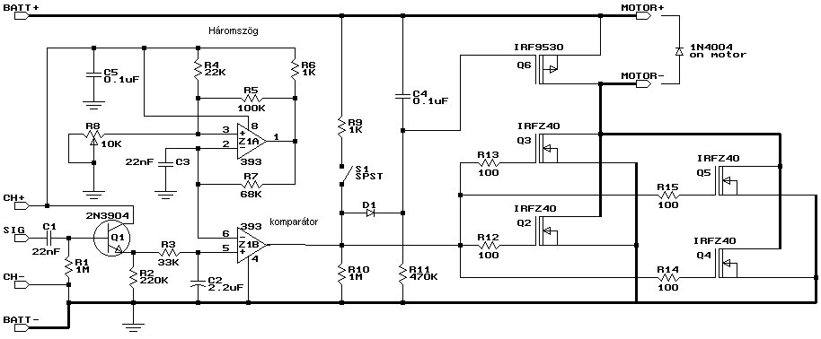Ez Egy RC modell motorvezérlő az IRF 9530 akkor megy, amikor a motor nem, rövidrezárja a motort, un. fék állapot.