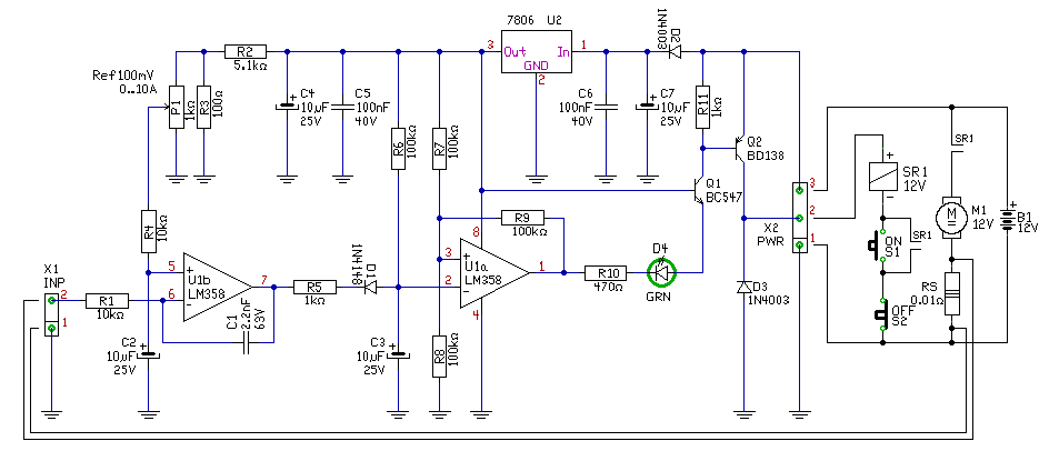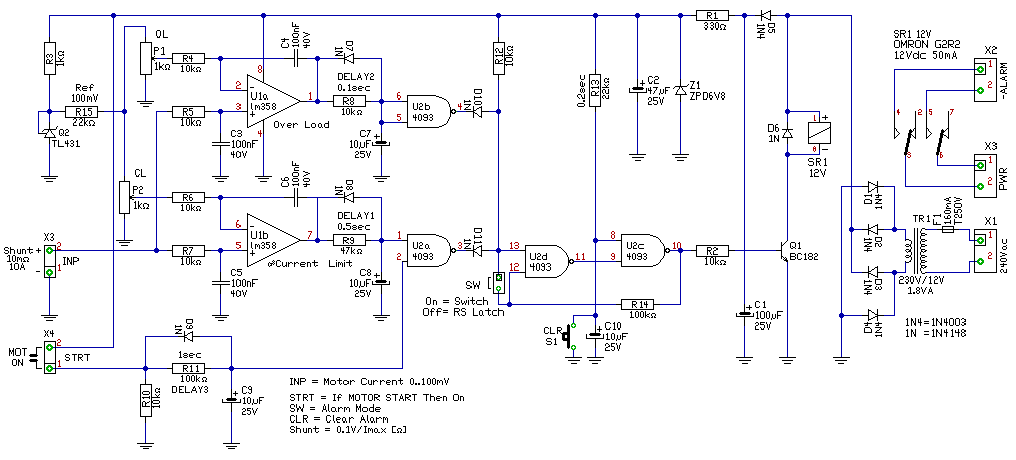 Közben elkészítettem egy egyszerűsített változatot is remélem ez jobban illeszkedik az elgondolásodhoz.. Ha az áram a beállított értéknél magasabb, akkor kb. fél másodpercre bontja a reléd áramkörét. Ettől az elejt, megszűnik az öntartás. De remélem a motor valami sima egyenfeszültségről működik, mert ha egy aksitöltőről, akkor ott azért problémák lehetnek a szűréssel.. üdv! proli007