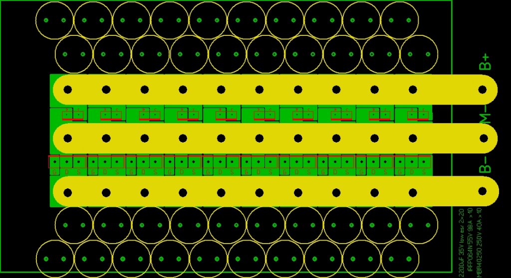 Látatlanban mondom, hogy 4 x 10mF nem fogja elbírni azt az áramot, amire igénybe lesznek véve. A kondik méretezésére is találsz leírást a korábbiakban. Ha jól emlékszem, a motorod 60V 300A. Ez ugye 18 kW. A kérdés az, hogy elég ez a teljesítmény, vagy esetleg gyorsításkor túl is akarod terhelni? 4...5-szörös áramot majdnem biztos, hogy kibír, de akkor már több FET kell.