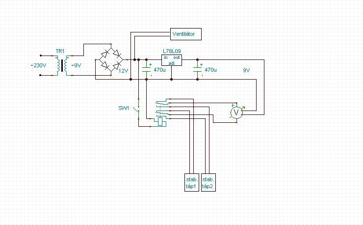 Jelenleg egy labor tápegység építésén fáradozom, és szeretném egy panel műszerrel ellátni. A tápegység kettős és egy darab panel műszert szeretnék használni. A kérdésem az lenne, hogy meg lehetne-e oldani egy relé kapcsolással? Egy kisebb trafóval szeretném az áramellátást létrehozni.A trafó szekunderén 9V váltó van amellyet egyenírányítok így kapok 12V-ot. A 12 V-al egy ventilátort illetve az előbb említett relét, és egy 78l09-es stabilizátor IC-vel előállított 9V-al a panelműszert szeretném üzemeltettni. Az elgondolt kapcsolási rajzot csatoltam. További kérdésem az lenne, hogy mivel több helyen is olvastam a panelműszerek igényeiről vajon pontosan mérne-e ebben az esetben?
