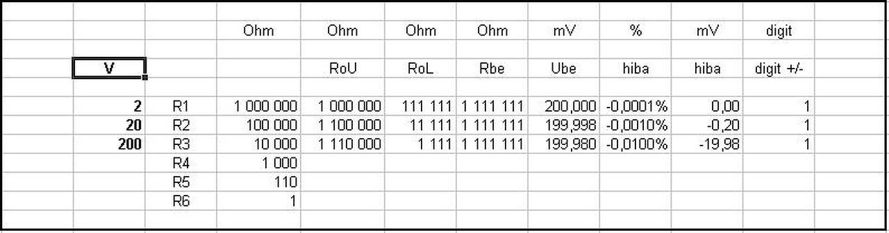 Idézet: „egy voltmérőtől elvárom , hogy magas legyen a belső ellenállása” Én így oldottam meg a 7106-tal készült panelműszereim feszültségosztóját: - szabványos értékű ellenállásokból épül fel a bemeneti osztó, - egy rövidzárral kiválasztható a kívánt mérési tartomány, - méréshatártól függetlenül ugyanakkora a bemenő ellenállás, ami - ezekkel az értékekkel 1M+ Ohm, de ha még ez is kevés, akkor minden ellenállást 10-zel szorozva, továbbra is szabányos értékekből 11M+ Ohm lesz - az ellenállások válogatásával (az osztó alsó tagja három különböző nagyságrendű értékből áll, van lehetőség hangolásra) a 7106 saját pontosságához illeszthető az osztó (a táblázatban a max. 1 digit hiba a kerekítés eredménye). Számos ilyen panelműszert építettem 1%-os 1206 ellenállásokkal az osztóban, a gyakorlatban a kijelzett érték mindig belül volt az 1 digit hibán.