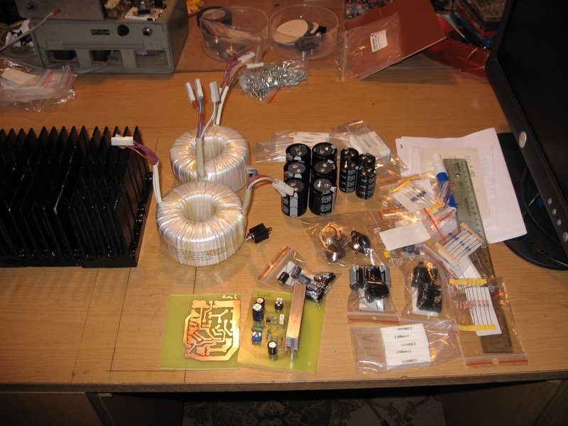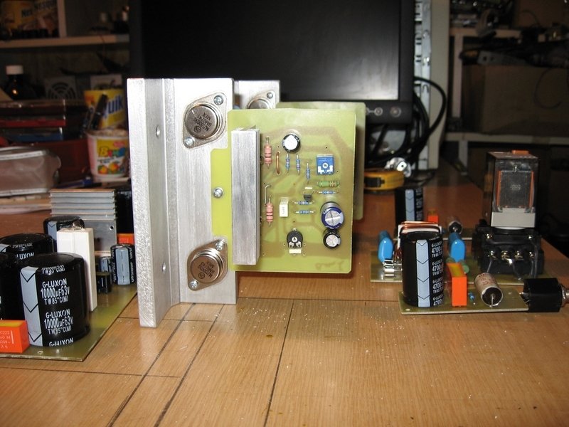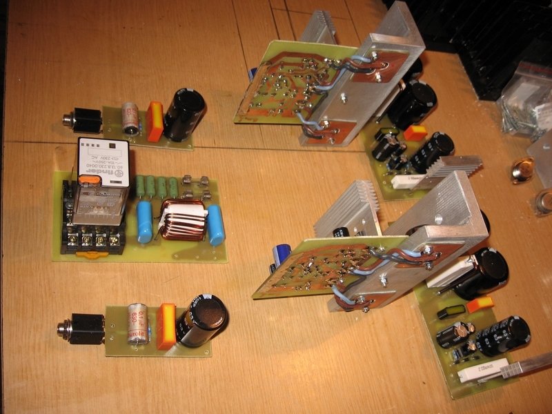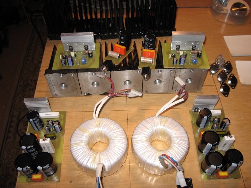 Nem volt egyszerű és még egy előlap így is hiányzik. A dobozolás maga több időt vett igénybe, mint maga az erősítő elkészítése. Gondot okozott, hogy a fémdobozom egy régi kiszuperált Philips CD deck fémháza, ami egy egyedi gyári konstrukció, így a sok kidudorodással megszenvedtem. Készítettem hozzá egy előerősítőt is, amit szintén ebbe a dobozba zsúfoltam. Ezzel az előerősítővel bizony meggyült a bajom, mert deszkamodellen frankón működött, de itt beszerelve összeszedett mindenféle nemkívánatos zajt. Végül sikerült minimalizálnom a zajt, és egy kapcsolóval is teljesen leválasztahtó a végfokról. Valószínű külön dobozba, külön tápegységgel lenne jó megépíteni. Az erősítő áramfelvételét szabályozó trimmert kicseréltem egy állandó állenállásra. MJ15003-as tranzisztorok fűtenek és zenélnek. A kicsatoló kondi 4700µF vele párhuzamosan kötve egy 4,7µF -os MKP Pufferkondenzátornak a képen is látható 10000µF -os amerikai gyártmányú SPRAGUE kondenzátort használok. Az erősítő 42V-os stabilizált tápegységről üzemel. Az áramfelvétele miután beáll egy állandó hőfokra kb. 1,8 A Az erősítő "tesztelése" folyamatosan zajlik. Már vittem "vendégségbe" is, ahol egyáltalán nem vallott szégyent. Itt Pesten szívesen állok elébe mindenféle meghallgatásnak és összehasonlításnak, ha az időm engedi. Az egyetlen bajom vele, hogy 14 kg-ot nyom a "vas" így nem olyan kellemes cipelni, de azért megoldható.