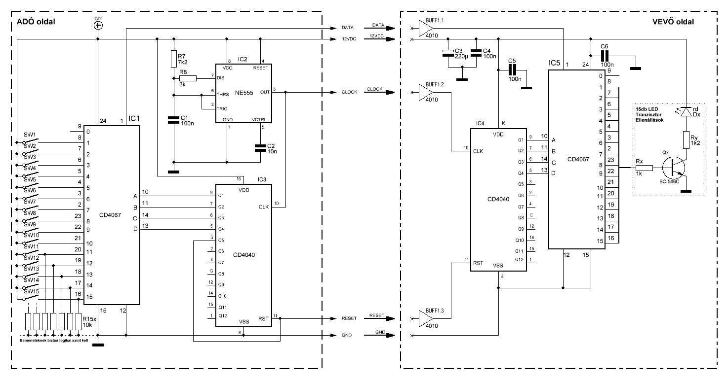 Igen a RESET lába 'elrajzoltam' a valóságban a vevő 4040 IC reset lábát az ADÓ oldal vezérli.