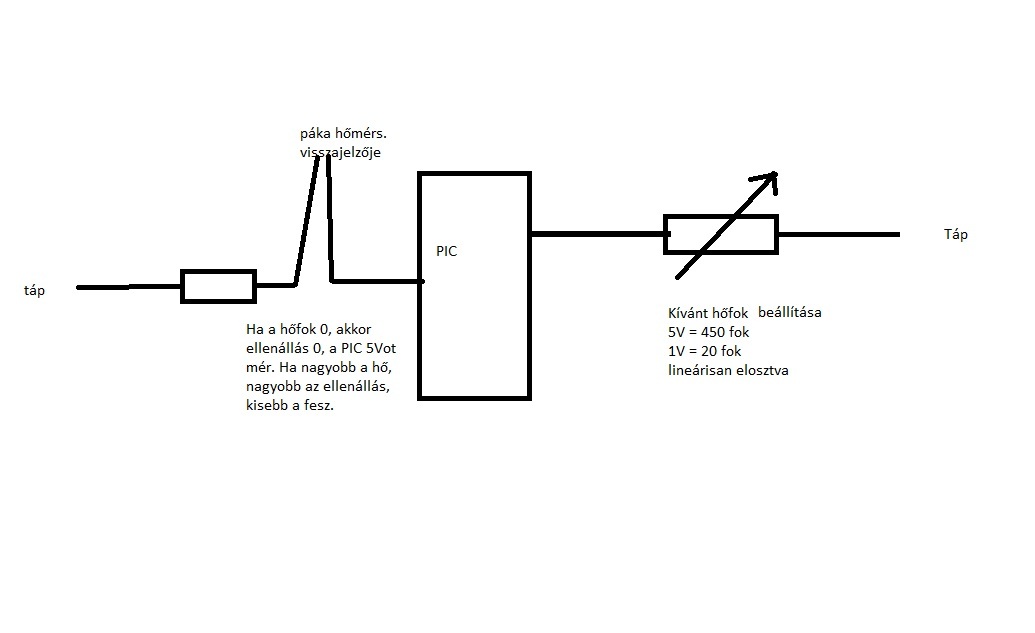 Megjött a Hakko 907-es forrasztópákám. Sajnos nincs még meg a PIC programozóm (az új) így csak elméletben próbálgatom kitalálni, hogyan is fogom megcsinálni a forrasztó állomást. Ha jól vettem ki a leírásokból (amit nem találtam még igazán jót a pákához!, csak amolyan innen-onnan infók alapján) hogy a hőmérséklet visszajelzést a páka ellenállás változással jelzi. Tervem a következő: Vannak táblázatok ahol leírják milyen hőfokhoz milyen ellenállás tartozik. Ezek alapján egy feszültség osztón vezetek rá áramot, és ahogy változik a hőmérséklet, változik az ellenállás, és ezzel a feszültség is. Na ezt kapná meg egy PIC, ami ADC-vel a feszültésg alapján ki, illetve bekapcsolná a páka 24V-os tápját (vagy PWM-mel szabályozná.. ez még kérdéses). Egy LCD panel beépítése, ami mutatná az értékeket, már csak részletkérdés. Megoldható szerintetek? Van az elképzelésben valami hiba? A kép hátha segít elképzelni az elképzelésemet. Egy gyakorlati példa: (saccolva, hasraütéssel) A potit beállítom, hogy 2,5V-ot kapjon a PIC, az jelentse azt, hogy fele a hőfok, vagyis 225 fok. Ehhez tartozik teszem azt 120 ohm, ami a bal oldalon 4,3V-ot eredményezne. Vagyis a PIC addig bekapcsolja a fűtést míg 4,3Vot nem kap balról. HA ez leesik pl 4,2re bekapcsolja, ha felmegy 4,4re akkor ki (vagy éppen PWM-mel szabályozza) Most persze nem találom a leírást hozzá, de legrosszabb esetben fűtés közben le kell mérni, hogy hány foknál hány ohm az ellenállás. Szóval: vélemény? Meg lehet oldani így? A hozzászólás módosítva: Feb 6, 2013