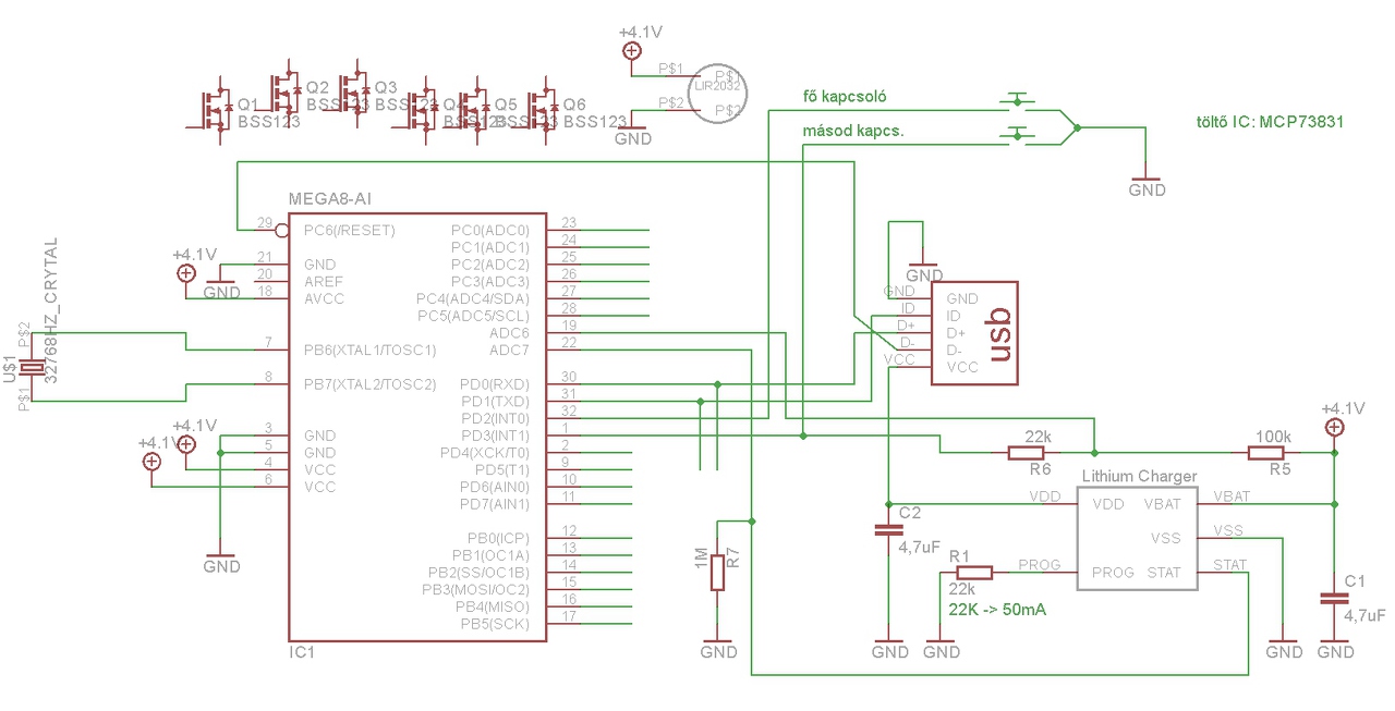 Mostanában vettem én is a fejembe egy kis karóra építését. Elképzelésem szerint egy SMD LED mátrixon jelezné ki az egyes adatokat. LIR2032-es akkuról menne, amit micro USB csatlakozón keresztül töltenék egy MCP73831 segítségével. Kérdés: érdemes lenne-e addig amíg az akkumulátorról működik a szerkezet a töltőáramkört leválasztani a telepről, ADC-vel figyelni, hogy van-e a töltőbemeneten feszültség, és ha megjelenik, az akkut csatlakoztatni a töltőáramkörhöz? Vagy Istvanpisti épp erre célzott? kicsit homályos ez most előttem. Köszönöm a segítségeteket!