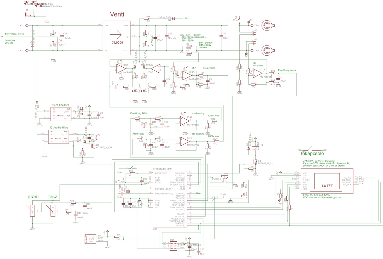 Értelme az egésznek: 1) A beállított áramkorlát értéke mindig látható lesz a kijelzőn, anélkül, hogy rövidre kellene zárni a tápegységet. 2) Jó hatásfok: 30W kimenő teljesítményig nem kell se hűtőborda, se ventilátor, 48W-nál egy 12V-os venti alacsony fordulatszámon elegendő hűtést biztosít (automata venti fordulatszám szabályzás). Tervezem nagyobb teljesítményű dc-dc konverter felhasználását, 100W kimenő teljesítmény a cél, 50V maximális feszültség mellett. 3) 10-28V között bármilyen tápegységgel táplálható, a kimeneten pedig 0-36V jelenik meg, maximum 3.5A, és 48W. 4) Nem kell külön kijelzőt építeni a kijelzéshez, és nem kell bajlódni, hogy a sönthöz hogyan kapcsolódjon hozzá. 5) Látható egyből a kimenő teljesítmény, mAh, mWh, beállított korlátok, és mért értékek. 6) Akár töltési karakterisztikát is lehetne betölteni, és akkor a rákapcsolt akkumulátort ez alapján töltené. 7) Mért értékek számítógépes logolása soros porton keresztül. 8) Négyvezetékes kimenet lehetősége 9) A beállított feszültség és áramkorlát értékét nem szükséges elmenteni, és egyből látja a poti állásából a felhasználó, hogy kb. hol is áll. 10) Az áramkorlát poti skálázása szoftverből megoldott úgy, hogy az alsó tartományban is könnyen beállítható legyenek az értékek. 11) A kimenet relével kapcsolt, így a mikrokontroller bármikor közbeavatkozhat, ha bármi is történne. Hővédelem, alacsony feszültség védelem is van, tehát akkumulátorról is használható. 12) Meg tudom-e oldani a felmerülő problémákat, létre tudok-e hozni egy mini labortápot, ami okos, jó hatásfokú, és amilyennel eddig még nem találkoztam sehol? Tanulok is közben sokat, és örömet is okoz. Szerinted hasztalan?