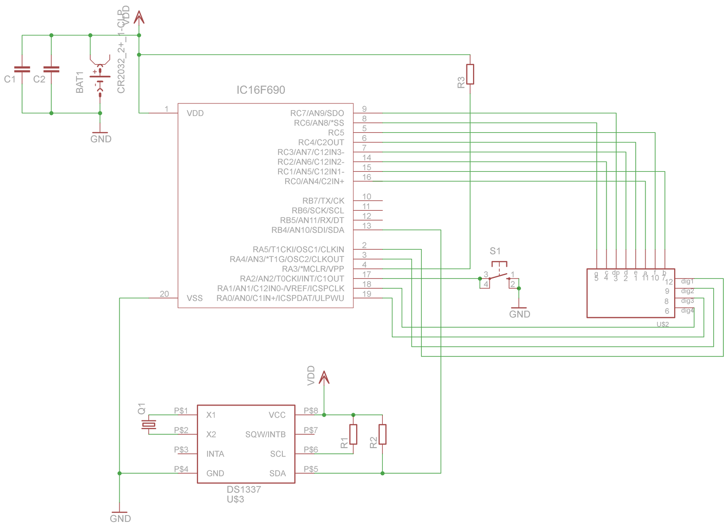 Sikerült összeraknom a 16f690 pic és ds1337 rtc alapú karórámat. A kijelző és a program is kicsit módosításra került az eredeti tervhez képest. A szoftverén kéne még módosítani, hogy a dátumot is meg tudja jeleníteni az rtc-ből.