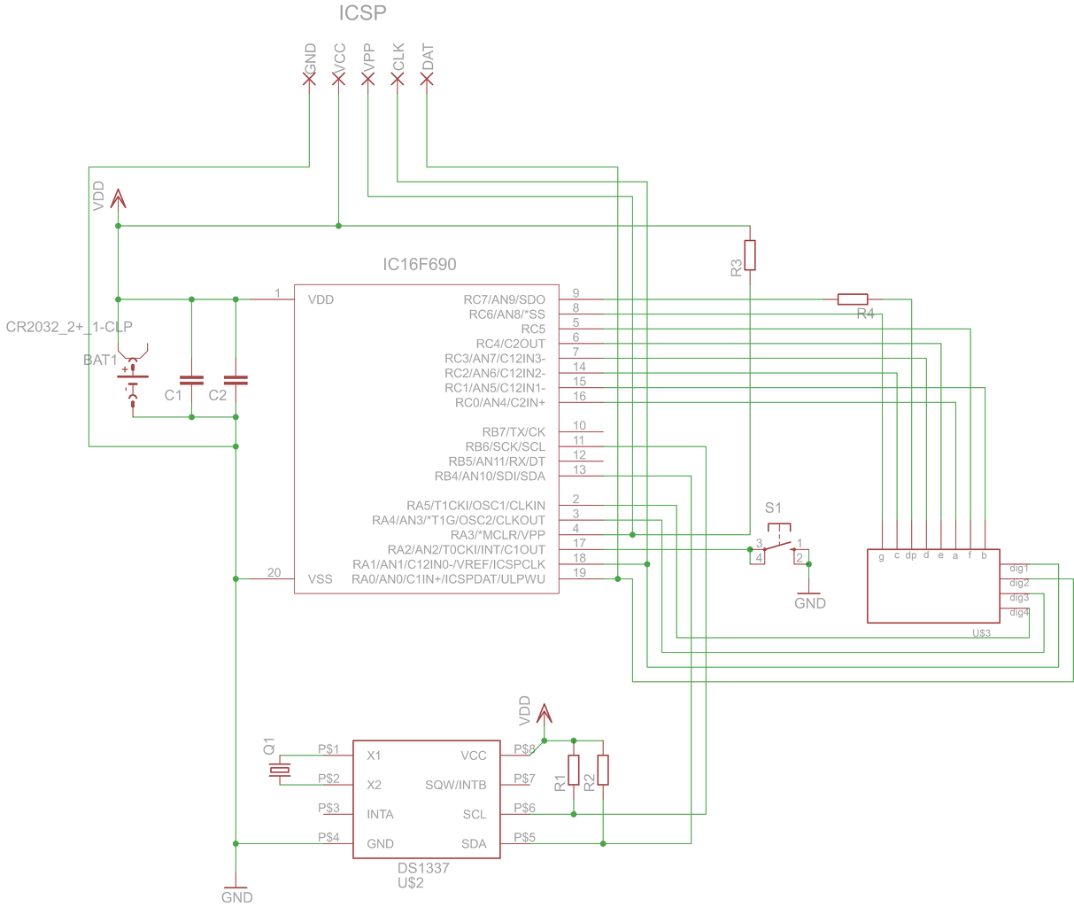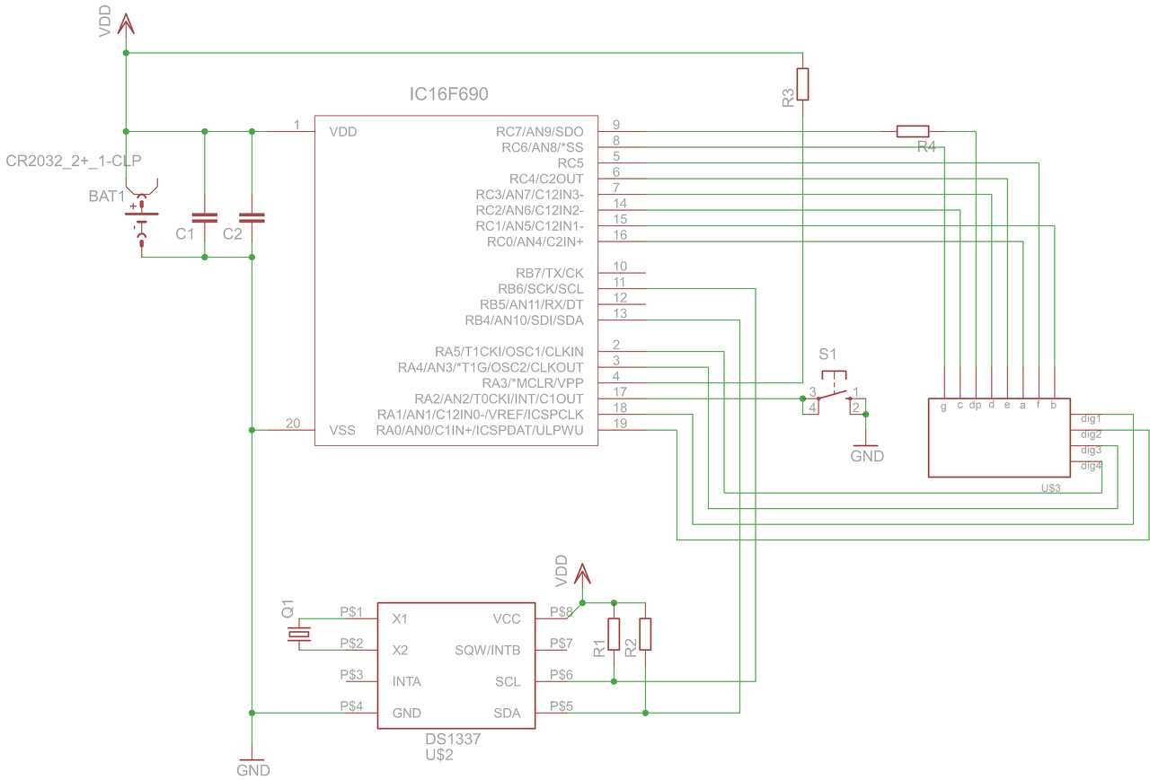 Szia, a C1 , C2 kondi még mindig nincs a helyén az egyiknek az rtc-nél masiknak a pic táp lábai között kell lennie közvetlenül a két láb között. Az rtc hasa alatt nem ajánlott vezetéket vinni , a kvarc külső házát egy ground plate-ra kell felforrasztani vagy leszorítani. Próbáltam belejavítani, de csak png van így nehezebb. A progit átírom... Ja és most látom, az R2-t is a + tápra kell kötni !
