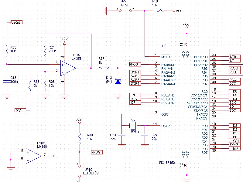 A kimeneti H híd negatív oldalán van két ellenállásból kiépítve mérő sönt. Ezen eső feszt erősíti ez az erősítő. Normál működéskor az erősítése 20, így 5A-nál pont 5V kerül az A/D bemenetére. Ebből a jelből lesz a túláramvédelem vagy akár kijelezhető a pillanatnyi áram. Programozó módban viszont ez a felbontás elég durva hiszen egy 60mA-es áram impulzust kell érzékelni (így 1 bit = 19,6mA). Ezért programozáskor a pic a MV lábát lehúzza 0-ra (eddig lebegett) és az erősítés 50 lesz, igy 1 bit 7mA-t ér sokkal nagyobb értékkekel dolgozhatok.