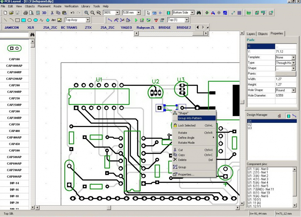 Ungroup Pattern funkcióval az összes alkatrészed darabokra van bontva!!!!! A Group Into Pattern funkcióval egyesítsd az összes alkatrészt külön-külön. Bal egérgomb lenyomásával körbe keríted a -----megjelenő négyzettel---- az alkatrészt, majd ráviszed az egérmutatót az alkatrész egyik részéhez (Top Silk) és jobb egér gombbal kattintasz egy Group Into Patter-t. Most már megjelennek az alkatrészeid feliratozásai(is).