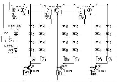 A ledek helyett a szegmenseket kell egybekötni és az ellenállásokat újraszámolni. Igaz, ez a kapcsolás csak SMD alkatrészekkel lenne mérethelyes diszkóékszer.