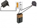Mellékeltem egy "rajzot". Az adaptert kösd rá a relé tekercsére, a piezzót meg az elemre a relé pogácsáin keresztül. A piezzót (pici kis sípoló) meg tudod venni bármelyik elektronikai alkatrész boltban pár forintért. Nyilván a relé és az adapter feszültsége legyen egyforma.